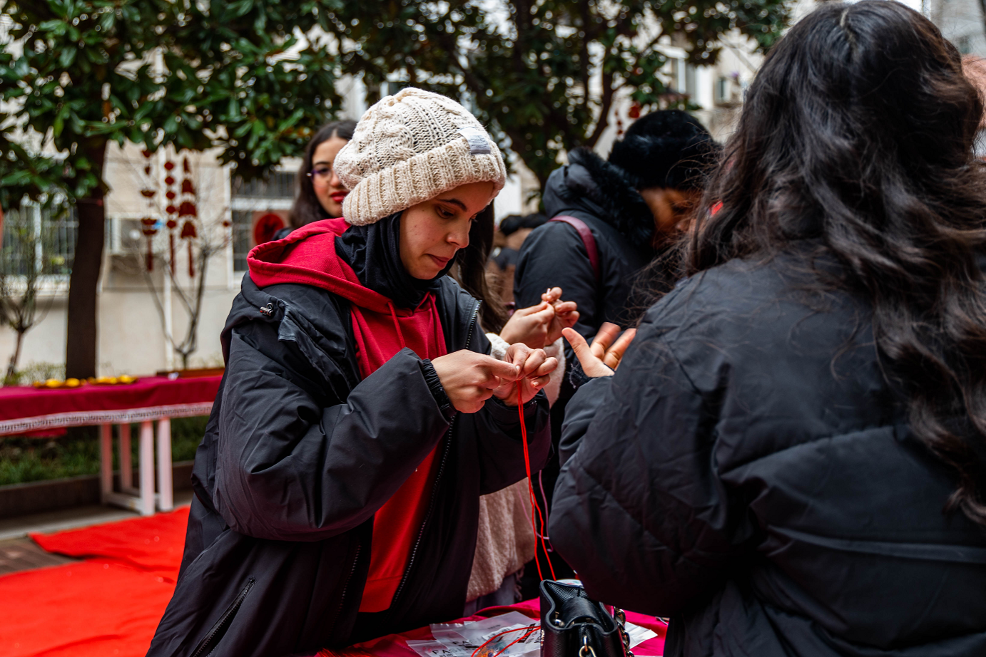中国结文化展位前,国际学生“红色丝线纷交错,中国结缘心相随。编织心愿送祝福,中外一家共团圆。”
