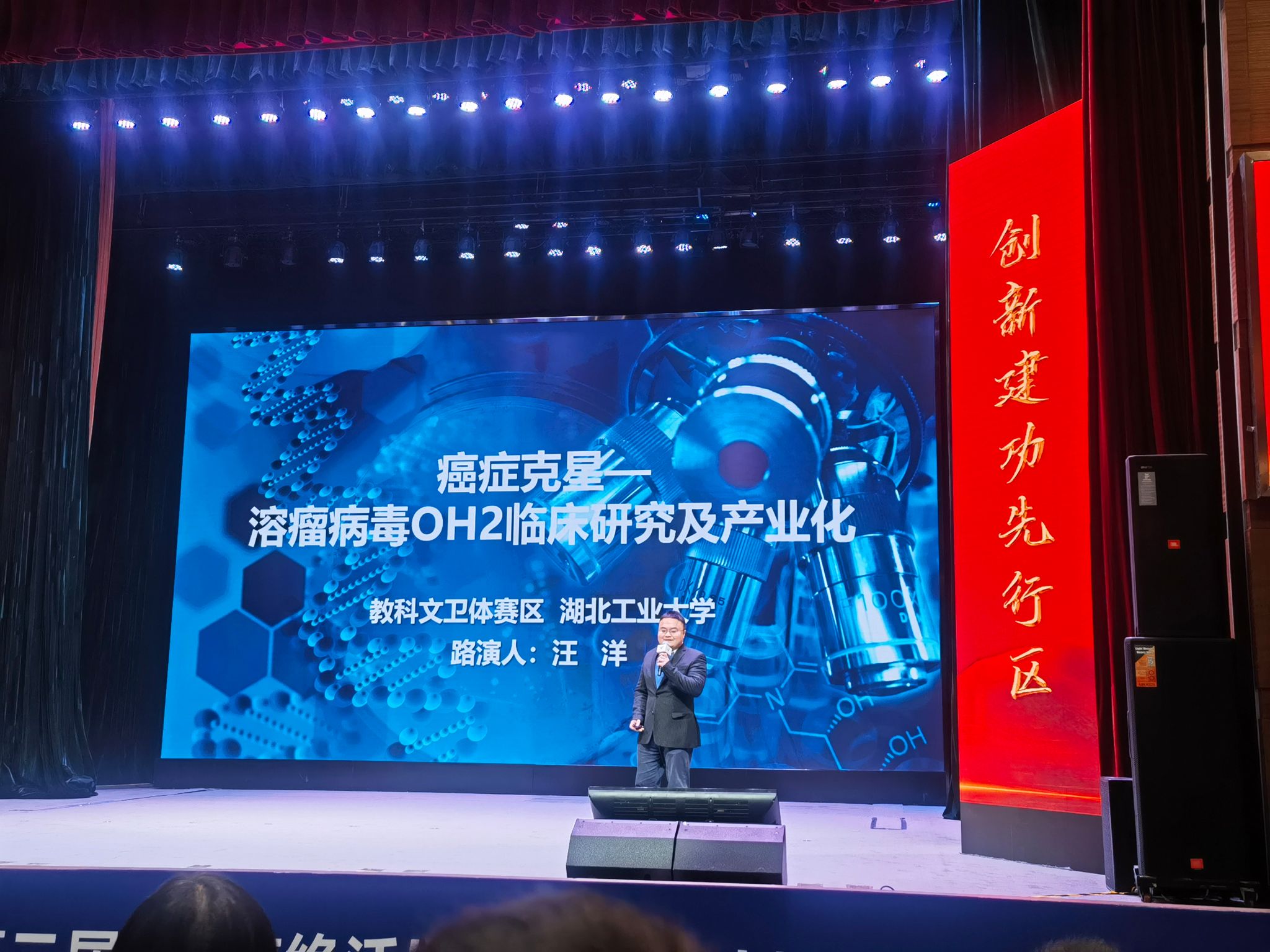 根据展示活动安排,汪洋作为获奖代表,携竞赛项目“癌症克星——溶瘤病毒OH2抗肿瘤临床研究及产业化”进行了现场路演展示,赢得嘉宾、观众的热烈掌声。