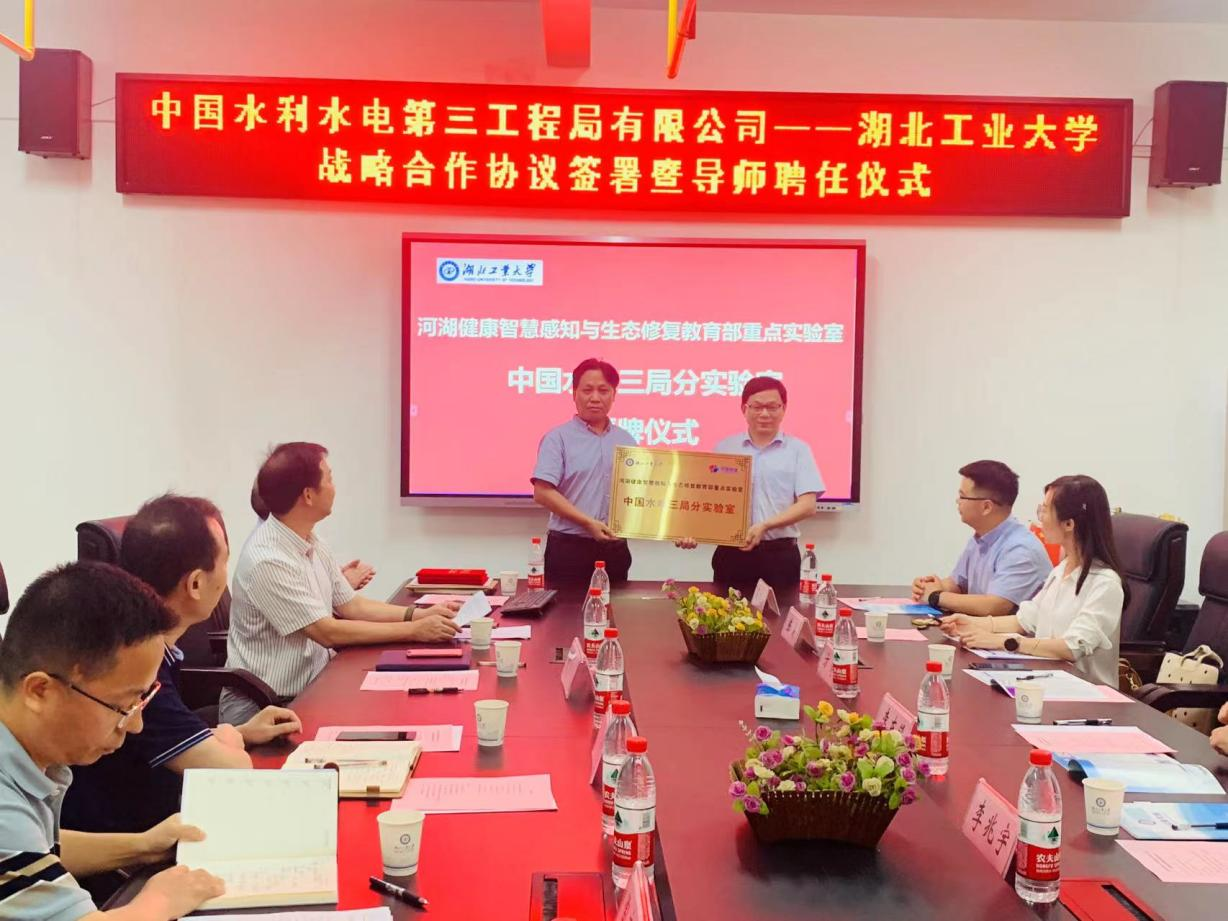 河湖健康智慧感知与生态修复教育部重点实验室副主任陶高梁教授宣读了“河湖健康智慧感知与生态修复教育部重点实验室中水电三局分实验室”成立文件,胡心彬为中国水利水电第三工程局有限公司授“教育部重点实验室水电三局分实验室”牌。
