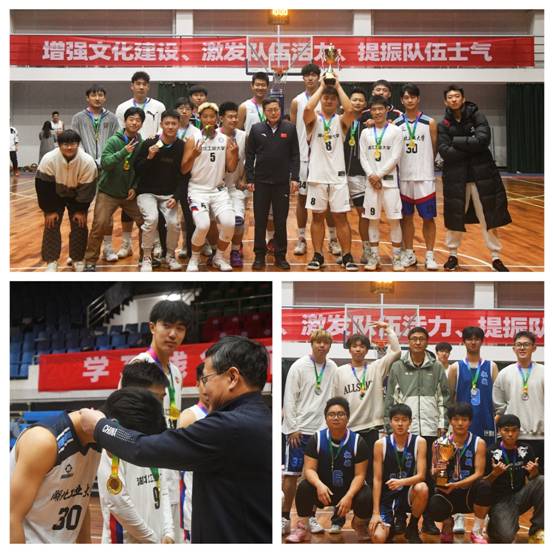 在经过四节的激烈比赛之后,经济与管理学院凭借着外线精准的三分和流畅的配合,以大比分的优势捧起2023湖工杯的冠军奖杯!校体育运动委员会副主任、党委常委、副校长龚发云教授观看决赛并为冠军球队颁奖,体育学院领导班子陪同。