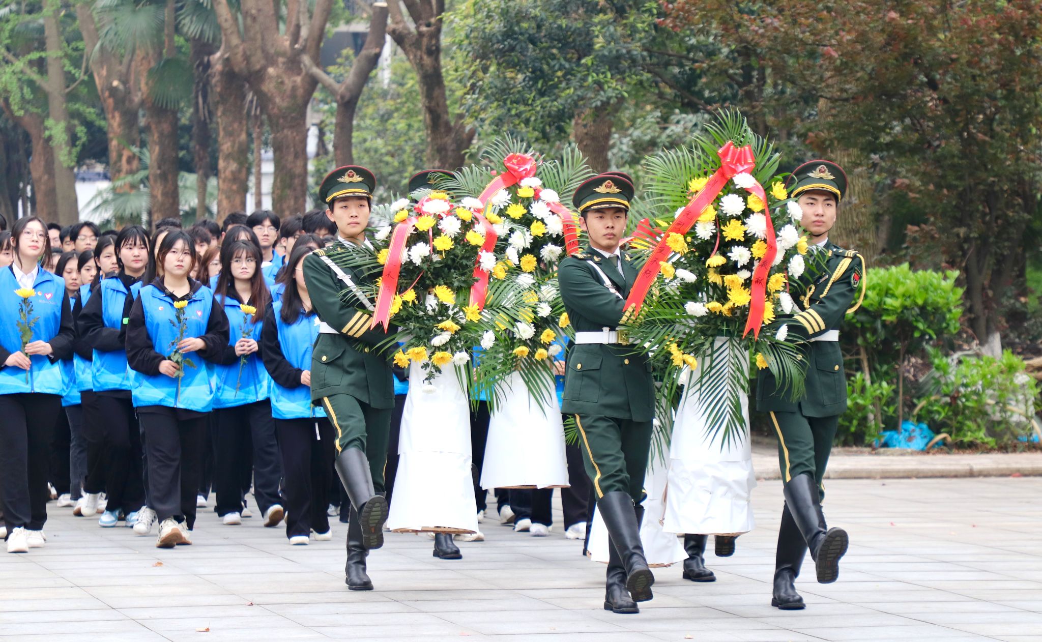默哀结束后,同学们依次为纪念碑献上鲜花并瞻仰烈士纪念碑,表达对烈士的深切怀念和浓浓哀思。