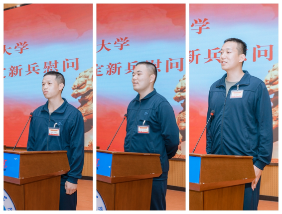 欢送会上,三名入伍学生代表慷慨发言。计算机学院19级毕业生陈嘉利希望到祖国最艰苦的地方服役,向已是现役军人的哥哥看齐,磨练意志,苦练本领,成为尖兵;工设学院22级在校生高子健体型偏胖,在第一次跑三公里时,中途数次想放弃,凭着自己强大的信念坚持完成了训练,现在的他对自己的军旅梦充满了信心;经管学院19级毕业生信博文是一名篮球特长生,爷爷曾是一名老红军,从小爷爷就喜欢抱着他讲述军旅故事,当兵成为了他的梦想和追求,他也将带着保家卫国的使命将这份军人荣耀继续传承下去。
