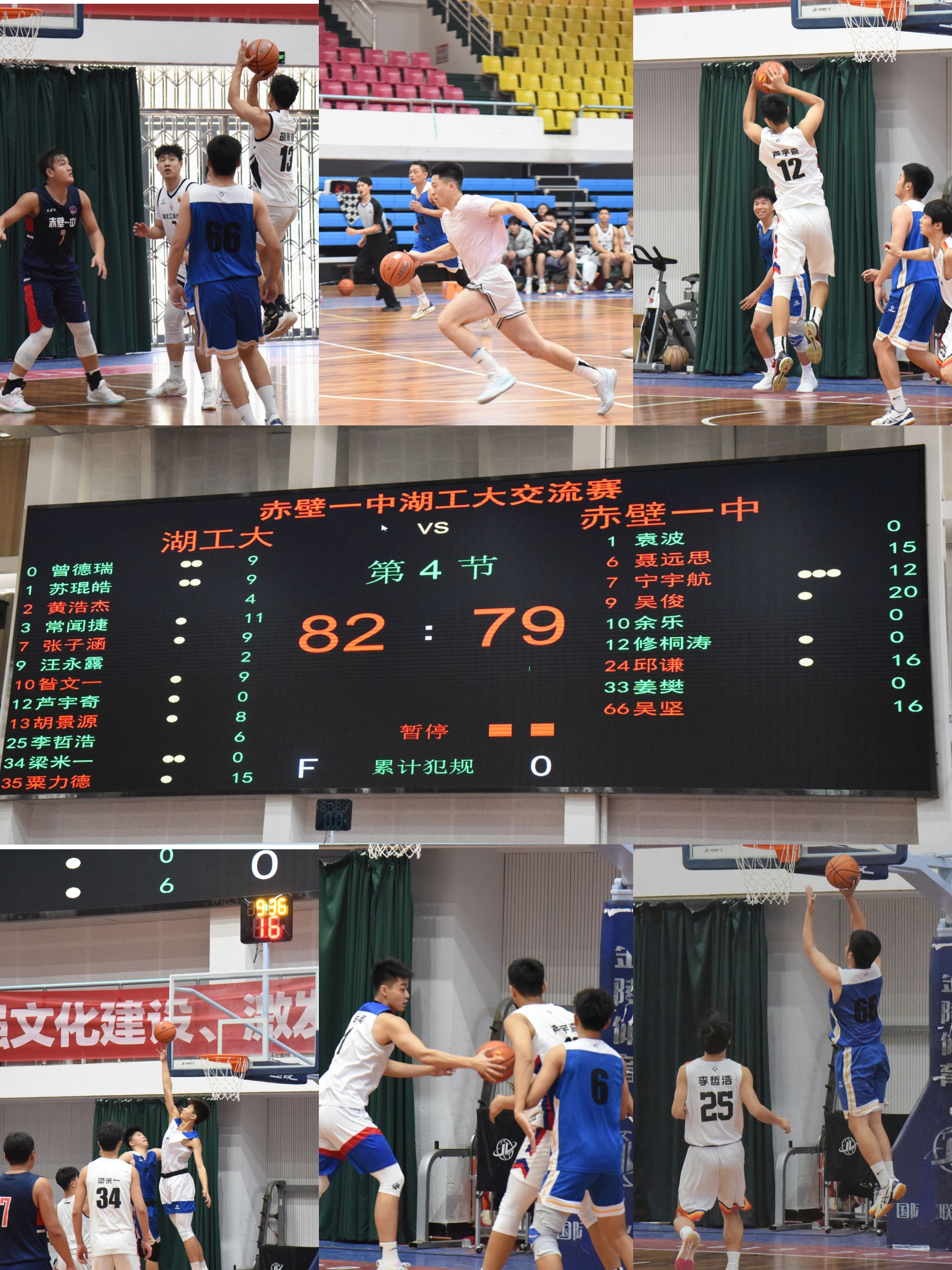 随后,赤壁一中赤子之心篮球校队和湖工大男篮进行了一场篮球友谊赛。双方总教练分别是宋爱明校长和王磊教授。双方队员在球场上你争我夺、穿插跑位、突破传球,奋勇拼抢。我校篮球队员连连突破,上篮得分。赤子之心篮球队配合默契,以犀利的突防迅速实现反超。赛场上的比分多次交替领先。最终,我校男篮以82:79的比分获胜。