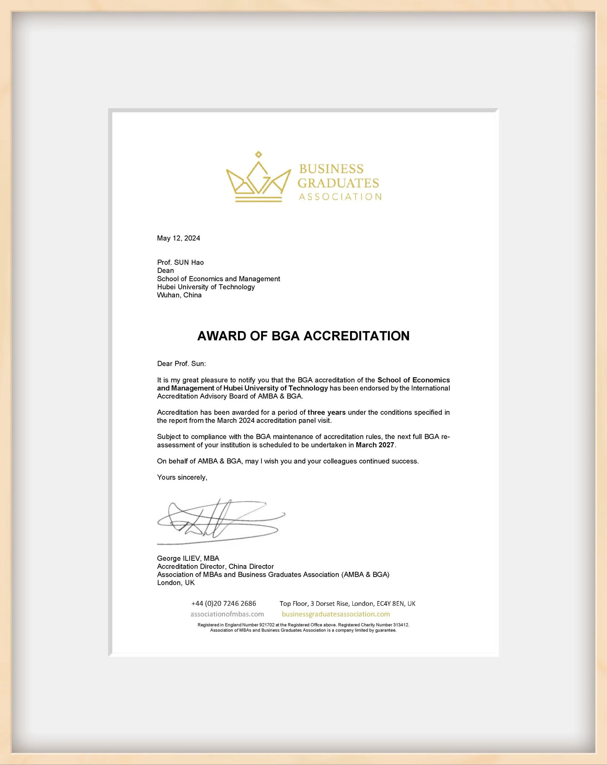 5月21日,经济与管理学院收到英国商学院毕业生协会(Business Graduates Association,简称BGA,是全球商学教育三大认证体系之一)发来的官方贺信,祝贺学院顺利通过BGA国际金牌认证,标志着学院成为湖北省属高校首所单独获得BGA金牌认证的商学院,同时也是我校获得的首个国际商科认证,成为继中南财经政法大学工商管理学院、武汉理工大学管理学院后第三家通过BGA国际金牌认证的省内商科学院。