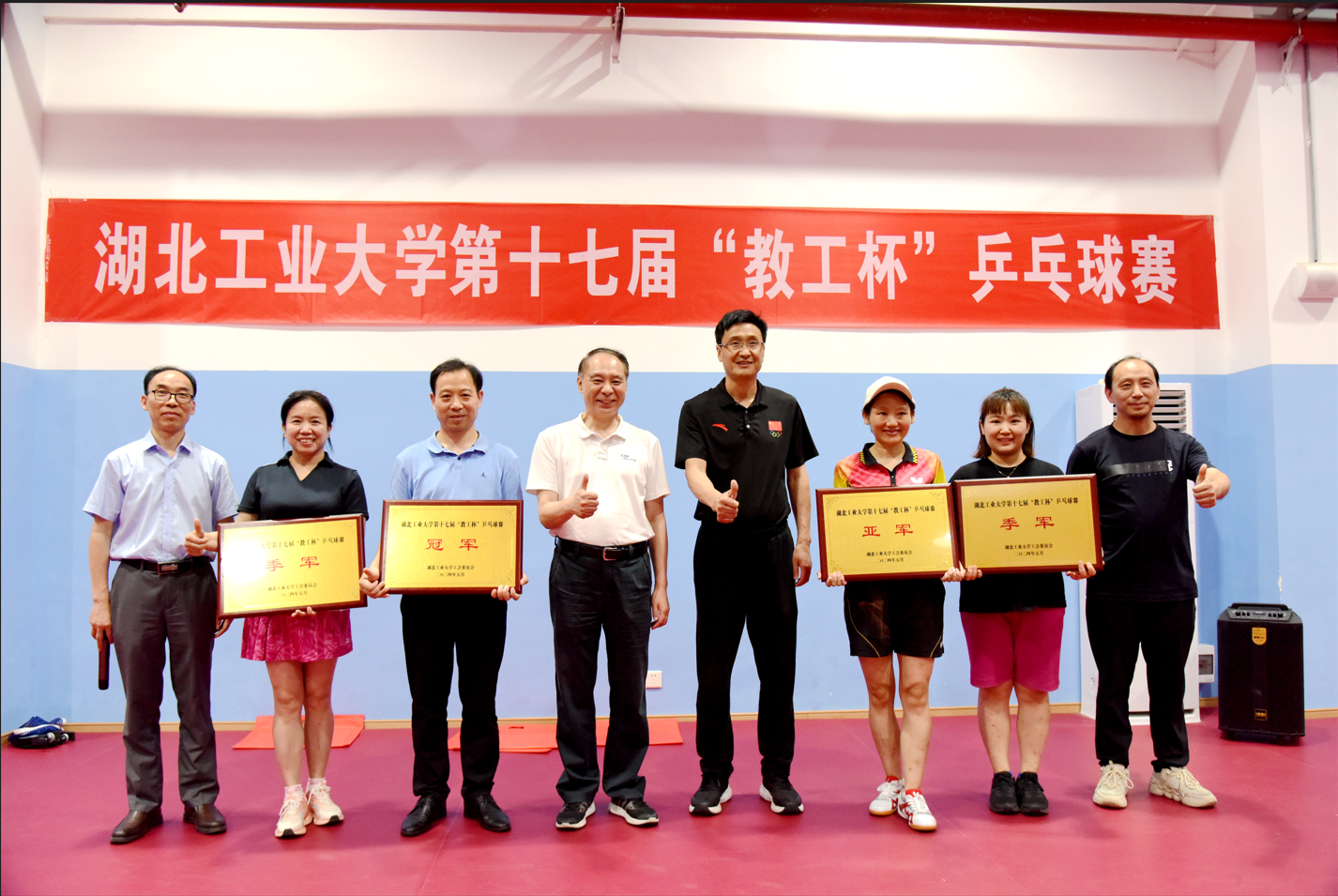 5月20日晚,湖北工业大学第十七届“教工杯”乒乓球赛圆满落下帷幕。校党委常委、副校长王侃观看比赛并参加闭幕式。