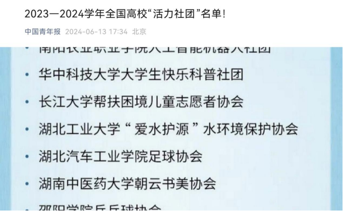 近日,团中央基层建设部、中国青年报社公布了2023-2024学年全国高校“活力社团”名单,我校土木建筑与环境学院“爱水护源”水环境保护协会成功入选。全国上榜高校100所,其中湖北省域高校4所。