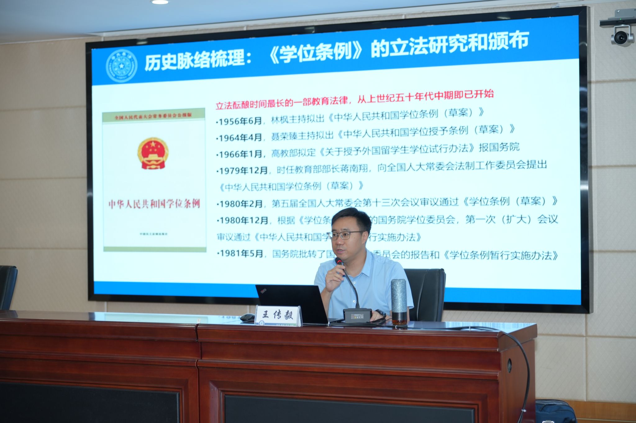 王传毅作了题为“贯彻落实《学位法》为教育强国建设提供制度保障”的报告。报告围绕《中华人民共和国学位法》的制定背景和过程、要点内容、新增和修订内容变化、学习贯彻《学位法》的若干问题等内容对《学位法》作了深入浅出的解读。他强调,《学位法》通过全面总结《学位条例》实施40多年来的成果和经验,对学位类型、学位工作体制、学位授予资格制度、学位授予条件和程序以及学位质量保障体系等方面均作了详细规定,有针对性的破解了学位工作中存在的问题,更好的适应教育强国的高质量发展要求,是我国学位工作和教育法治建设的一项重大成果,为我国学位与研究生教育事业持续发展提供了坚强有力的法治保障。