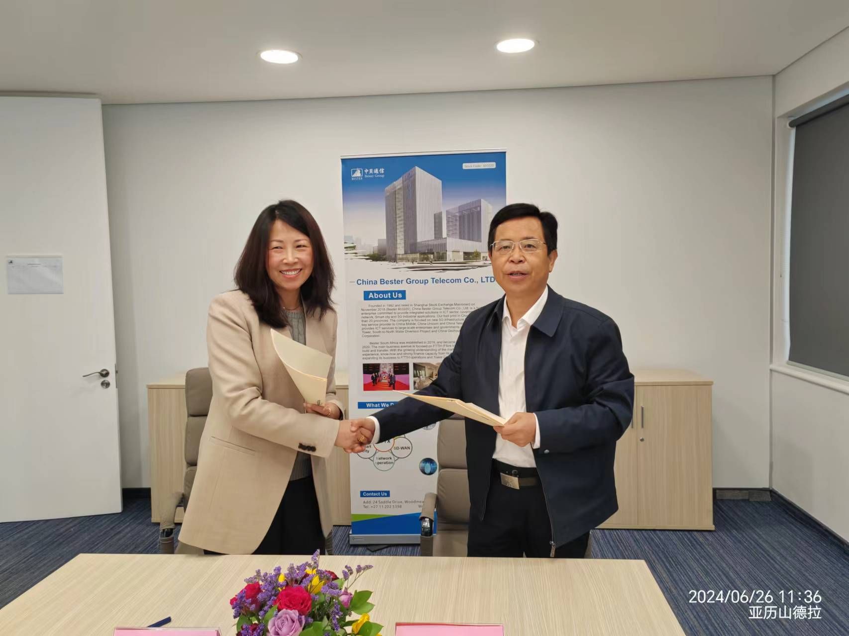 6月26日,代表团实地考察中贝通信南非分公司。该公司首席执行官高畅女士介绍了公司在5G通信、新算力、智慧城市、光电子及新能源领域的合作业务,双方就开展相关领域的校企合作进行交流,达成合作意向,签署了合作建立国际学生实习实践基地协议,为中非青年赴非实习、就业提供岗位与培训,双方还将启动科研人员交流互助计划。