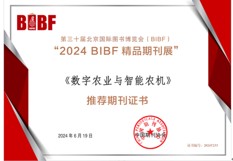 近日,我校科技期刊《数字农业与智能农机》获第三十届北京国际图书博览会“2024BIBF精品期刊展”推荐期刊证书。