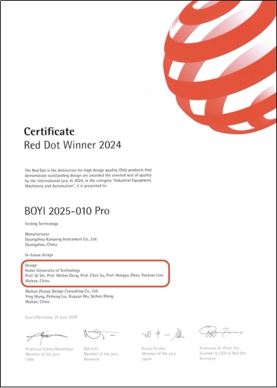 2024年德国红点产品设计奖(RedDotAward)获奖名单日前揭晓,由我校工业设计学院教师施琦带领的师生团队与企业合作研发的《BOYI2025-010 Pro》万能材料试验机设计,斩获国际顶级行业设计大奖“德国红点产品设计奖”(https://www.red-dot.org/zh/project/boyi-2025-010-pro-69638 )。