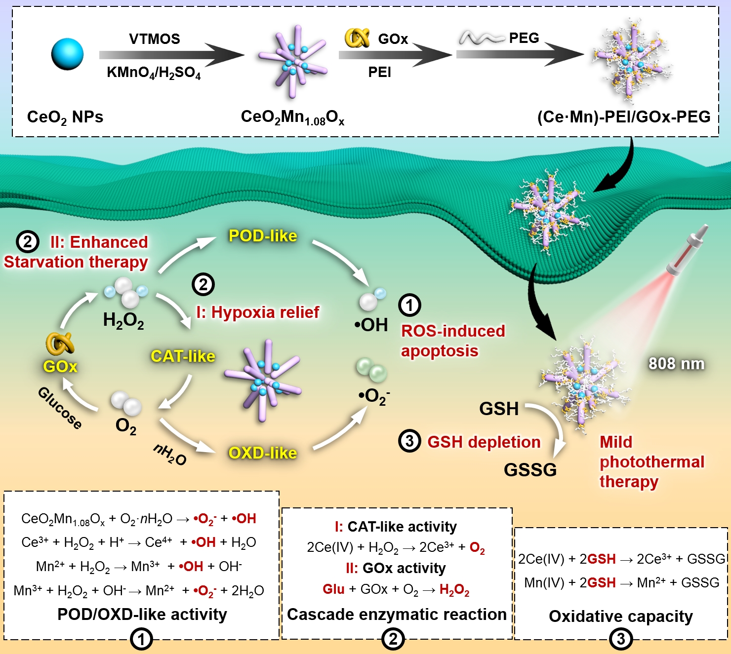 纳米酶是一类具有生物催化功能的纳米材料,能够基于特定的纳米结构催化天然酶的底物并作为酶的代替品,其概念由中国科学家阎锡蕴院士首先提出。国际纯粹与应用化学联合会(IUPAC)将纳米酶技术列为2022年化学领域十大新兴技术之一。基于纳米酶的催化治疗是一种新兴的癌症治疗方法。此前,李草团队系统研究了二氧化锰(MnO2)纳米粒子基纳米酶在肿瘤治疗中的应用并取得了一系列成果(Acta Biomater.,2021,126, 445-462;J. Colloid Interf. Sci.,2024,666,244-258;J. Colloid Interf. Sci.,2023,634,836-851;Mater. Today Chem.,2024,39,102171;Microchim. Acta,2021,188, 141)。在此基础上,他们通过简单的氧化还原反应构建了一种由二氧化铈(CeO2)纳米粒子与MnO2构成的新型Ce-Mn异质结CeO2Mn1.08Ox纳米团簇。该异质结在酸性条件具有较高的类过氧化氢酶(CAT)、过氧化物酶(POD)和氧化酶(OXD)活性。特殊的结构在显著提升MnO2与CeO2各种催化活性的基础上赋予了CeO2Mn1.08Ox两种纳米粒子原本不具备的近红外(NIR)光热能力。同时,与绝大部分纳米酶不同,CeO2Mn1.08Ox在微酸性条件下拥有更强的类CAT酶活,更适合在癌细胞内发挥疗效。