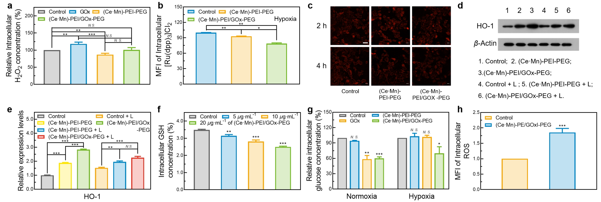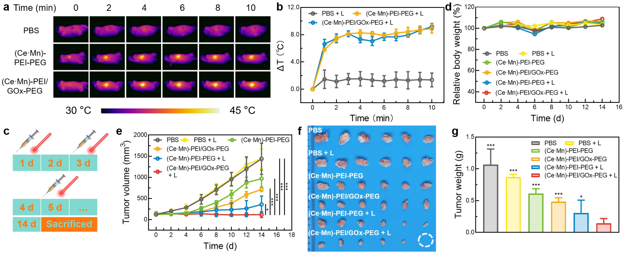 随后,他们将葡萄糖氧化酶(GOx)载入至CeO2Mn1.08Ox,并与聚乙二醇(PEG)连接,构建了一种级联酶型纳米药物(Ce-Mn)-PEI/GOx-PEG。CeO2Mn1.08Ox肿瘤特异性的强类CAT活性可增敏基于GOx的饥饿治疗。其类POD和OXD特性可在癌细胞中产生高细胞毒性的活性氧(ROS)。葡萄糖分解产物H2O2可用于产生O2和ROS。(Ce-Mn)-PEI/GOx-PEG也可通过缓解乏氧和消耗内源性谷胱甘肽(GSH)来调节肿瘤微环境。CeO2Mn1.08Ox的光热能力使其可用于NIR区光热治疗。密度泛函理论(DFT)计算为CeO2Mn1.08Ox的特异性高催化活性和光热能力提供了可能的原因。在合理控制用药剂量的情况下,(Ce-Mn)-PEI/GOx-PEG可于小鼠体内实现增强的催化/低温光热联合治疗,在保证生物安全性的前提下有效消融肿瘤。