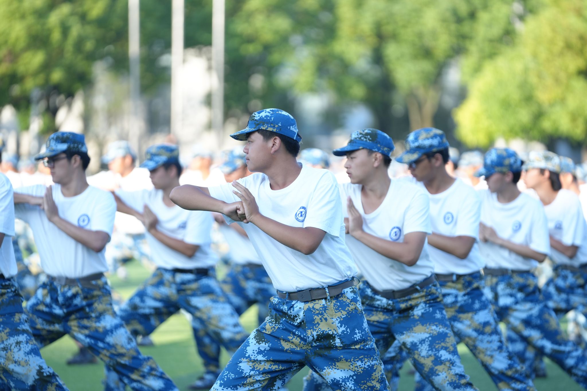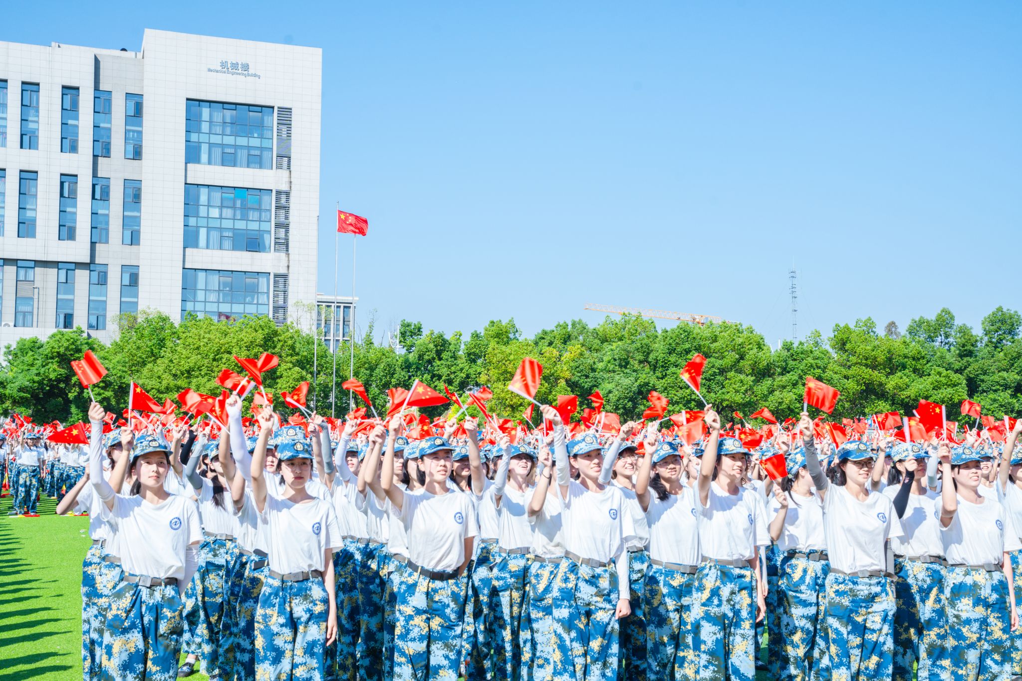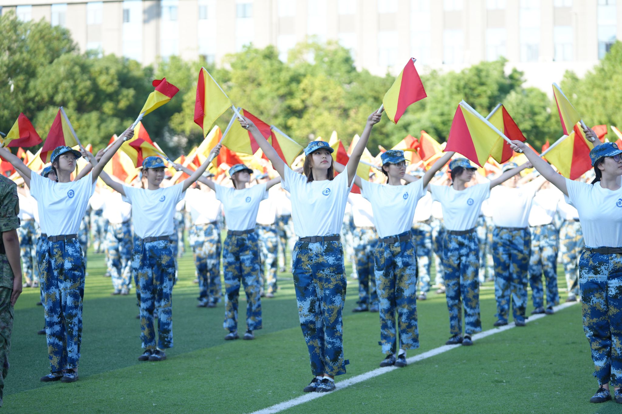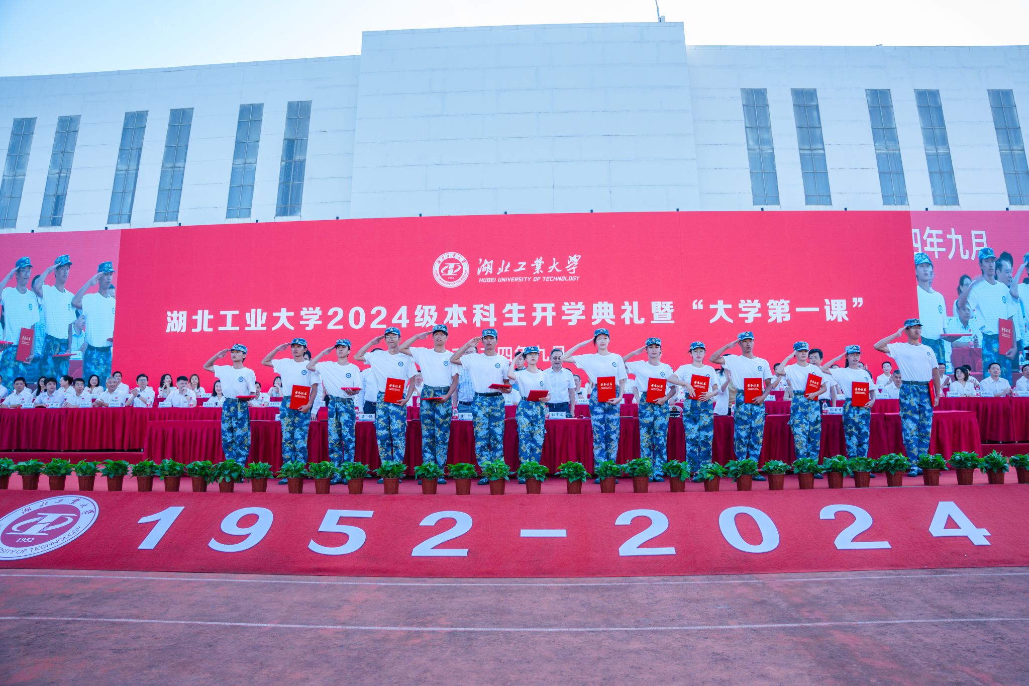 军训成果展示环节,由400名新生组成的军体拳方阵,动作整齐划一、虎虎生威、气势如虹。400名新生组成的旗语方阵,编排巧妙,依次呈现“我爱湖北工业大学”“1952”等字样和图案,令人震撼。