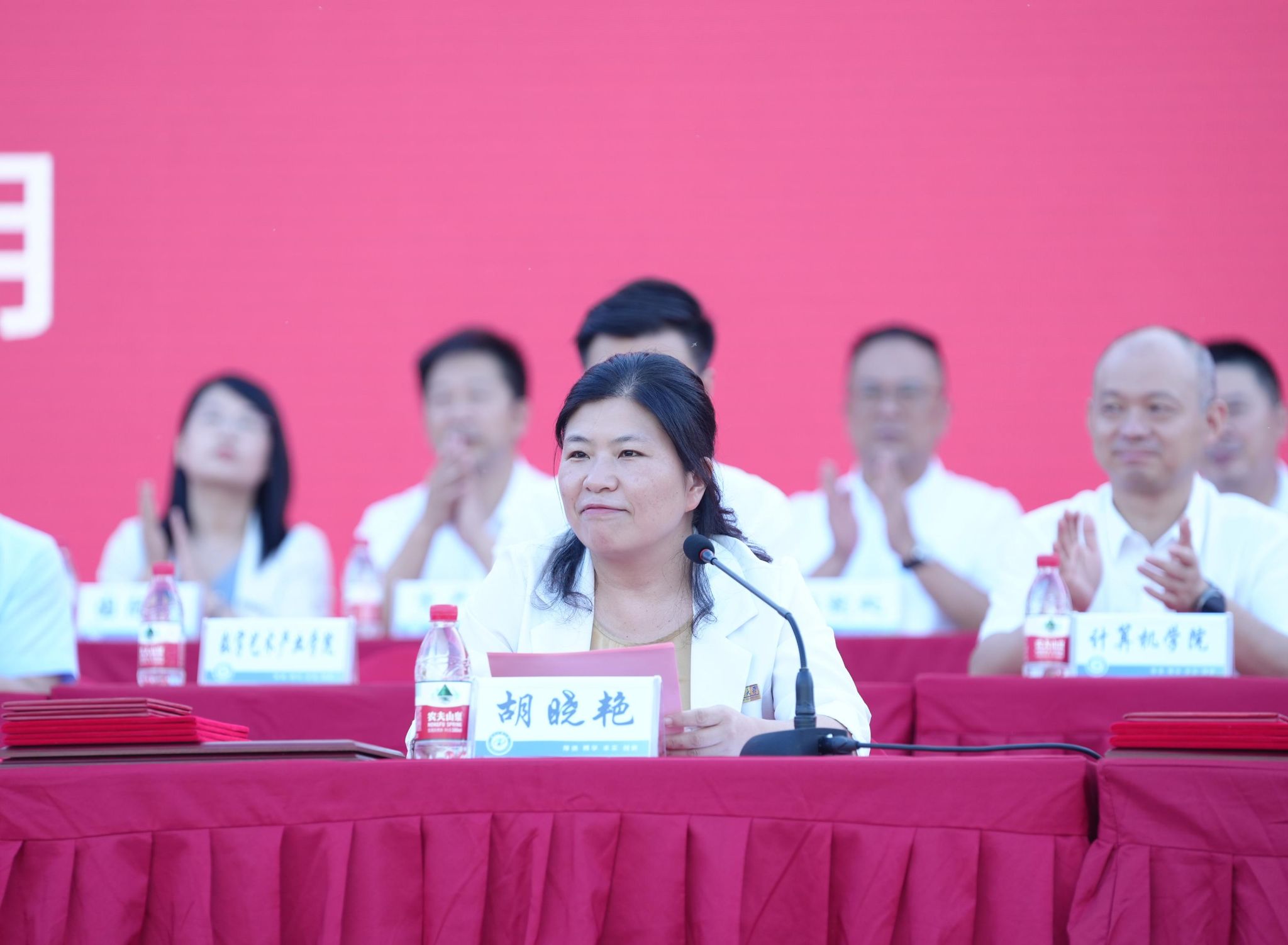 校党委书记彭育园代表学校向海军工程大学授予锦旗,感谢他们在军训工作中的辛勤付出与严格指导。全体师生以最热烈的掌声欢送军训教官离场。