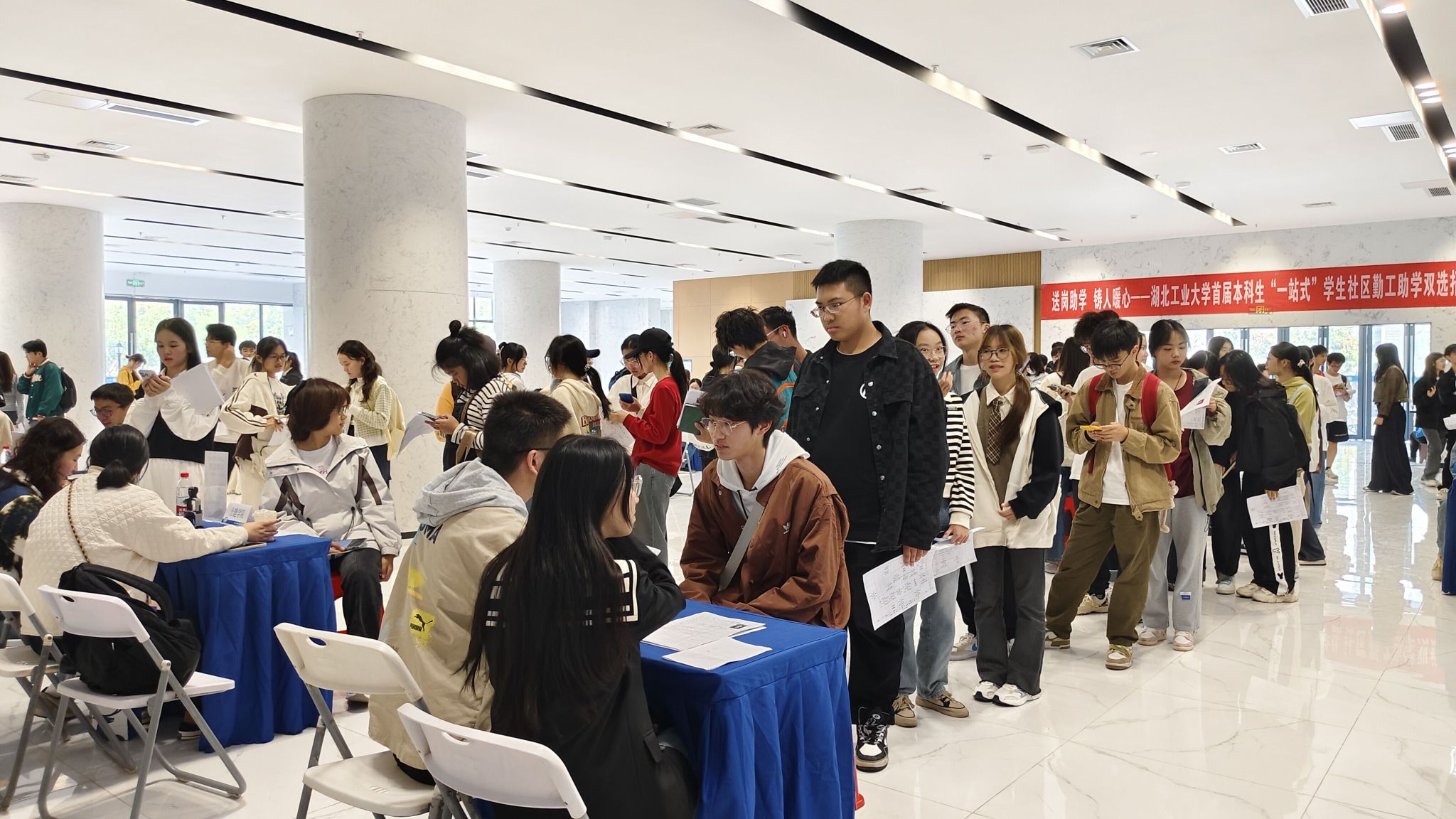 10月24日下午,“送岗助学铸人暖心”湖北工业大学首届本科生“一站式”学生社区勤工助学双选招聘会在双创楼成功举办。学校办公室、纪委、党委组织部、党委宣传部、党委教师工作部、党委学生工作部、各学院等45个部门的勤工助学指导教师及300余名学生参加双选招聘会。