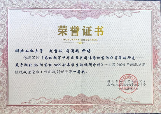 本次研讨会共收到来自包括部委属高校在内的全省34个会员单位报送的各类统战理论和工作实践成果230篇,由省委统战部、省社会主义学院、省委教育工委组织相关专家评审,共评选表彰优秀论文86篇、优秀组织奖单位8个。我校经济与管理学院刘雪姣、马克思主义学院蒋满娟等撰写的《高校铸牢中华民族共同体意识宣传教育策略研究——基于湖北30所高校1400余名学生的调研分析》获得一等奖,实现了学校统战理论研究成果的历史性突破。