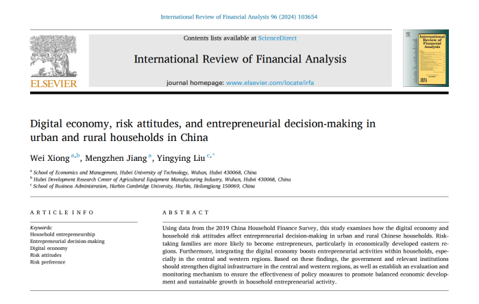 近日,湖北工业大学经济与管理学院熊伟教授PI团队在金融学领域国际知名期刊《International Review of Financial Analysis》发表题为“Digital economy, risk attitudes, and entrepreneurial decision-making in urban and rural households in China”的学术论文。这一研究发现为理解数字经济时代下城乡家庭创业行为提供了新的理论视角,对促进经济的均衡发展和城乡家庭创业的可持续增长具有重要意义。