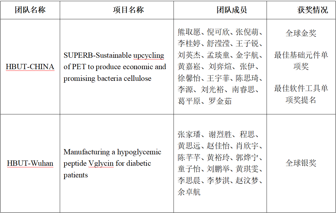 由郑学云、姚兰、代俊、唐景峰、凯文·施莱(美籍)指导的HBUT-China团队以SUPERB-Sustainable upcycling of PET to produce economic and promising bacteria cellulose为题,研究PET塑料的生物降解过程,利用其降解产物生产高经济价值的细菌纤维素,实现了废弃物的升级利用;由刘金彪、尧晨光、魏艳红、周策凡指导的HBUT-Wuhan团队则以Manufacturing a hypoglycemic peptide Vglycin for diabetic patients为题,利用生物合成的方式生产降糖肽Vglycin,解决了传统Vglycin提取工艺中效率低下的问题。在巴黎答辩现场,两支团队的代表与来自全球50多个国家的5000余名参赛者,共计438支队伍展开激烈角逐,最终凭借过硬的合成生物学知识、严谨的实验思路、新奇创新的实验设计,在众多优秀的参赛选手中脱颖而出——HBUT-China团队获得金奖,HBUT-Wuhan团队获得银奖。