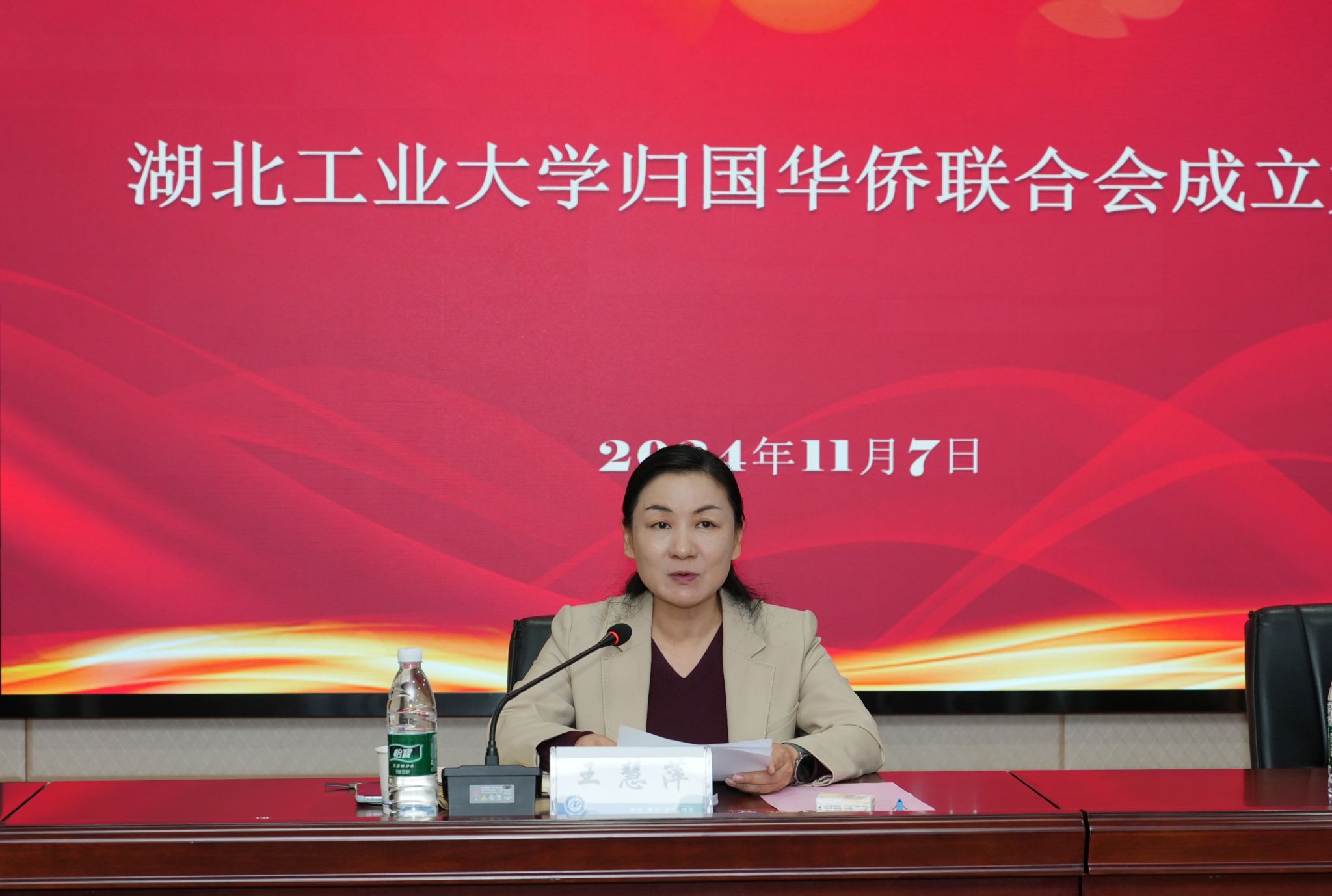 王慧萍代表省侨联向湖北工业大学归国华侨联合会的成立表示祝贺,希望新成立的湖工大侨联以习近平新时代中国特色社会主义思想为指导,充分发挥高校侨联人才智力优势,助力学校事业高质量发展和湖北地方经济建设,为中国式现代化湖北实践贡献湖工大侨界智慧和力量。她对校侨联提出三点要求:一要加强政治引领,不断提升向心力。要旗帜鲜明讲政治,持续强化理论武装,自觉承担起暖侨、爱侨、护侨,为党赢得侨心的政治责任。二强化责任担当,不断提升影响力。要紧紧围绕建设教育强国和“双一流”建设历史机遇,赋能学校事业发展;要聚焦发展大局,围绕湖北先行区建设目标,积极参与“三高地、两基地”“三大都市圈”建设,助力地方经济建设;要积极参政议政,服务党委政府科学决策。三要优化为侨服务,不断提升凝聚力。要广泛联系侨界群众,做侨胞的贴心人、侨务工作的实干家;要掌握工作方法,按照“五有”、“四联”、“三度”的要求,切实推动工作,争取最大实效。