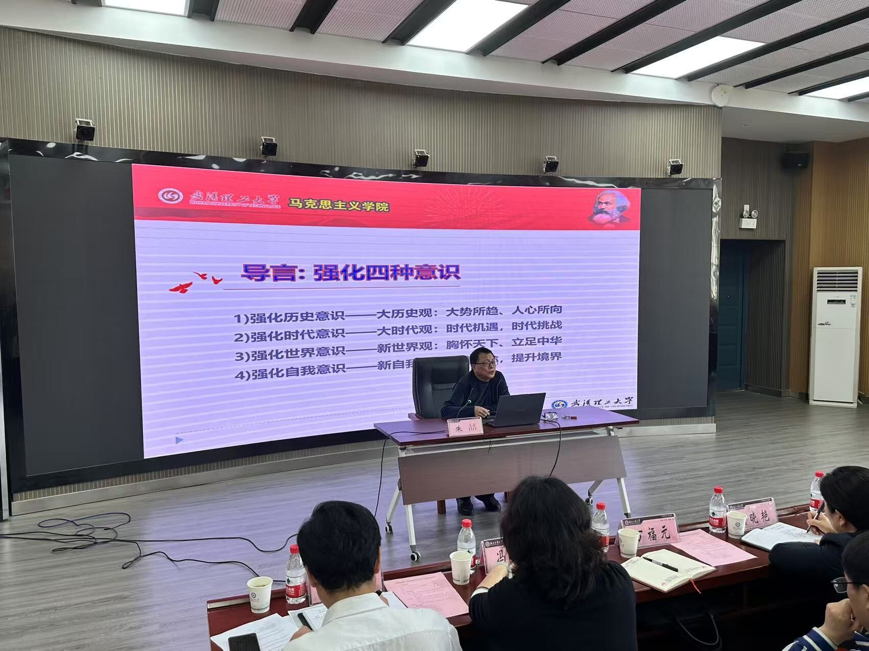 集体备课会由马克思主义学院院长丁银河教授主持,国家教指委形势与政策教指委委员、湖北省形势与政策教指委主任委员、武汉理工大学马克思主义学院朱喆教授作主题报告、武汉理工大学马克思主义学院青年教师王冬晓博士作示范教学、《时事报告》杂志社湖北教学服务中心万福元主任作教材相关情况说明,校党委副书记胡晓艳出席并作总结讲话,全校近百位形势与政策课专兼职教师参会。