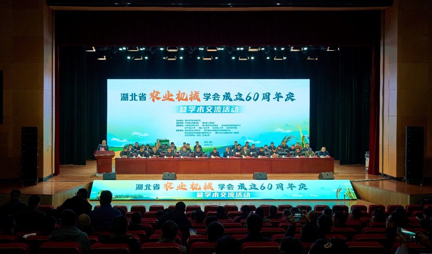 12月8日,湖北省农业机械学会60周年庆在湖北通山隆重举行,中国工程院院士、中国农业机械学会名誉理事长罗锡文、农业农村部农机化总站副站长刘小伟,中国农业机械学会理事长苑严伟、中国农业工程学会常务副理事长朱明、省科学技术协会副主席孙建刚、省农业事业发展中心副主任姜卫东、通山县委副书记、县长吴涛等行业专家领导出席此次盛会。校党委书记、湖北省农业机械学会第九届理事会理事长彭育园出席大会并发表讲话。