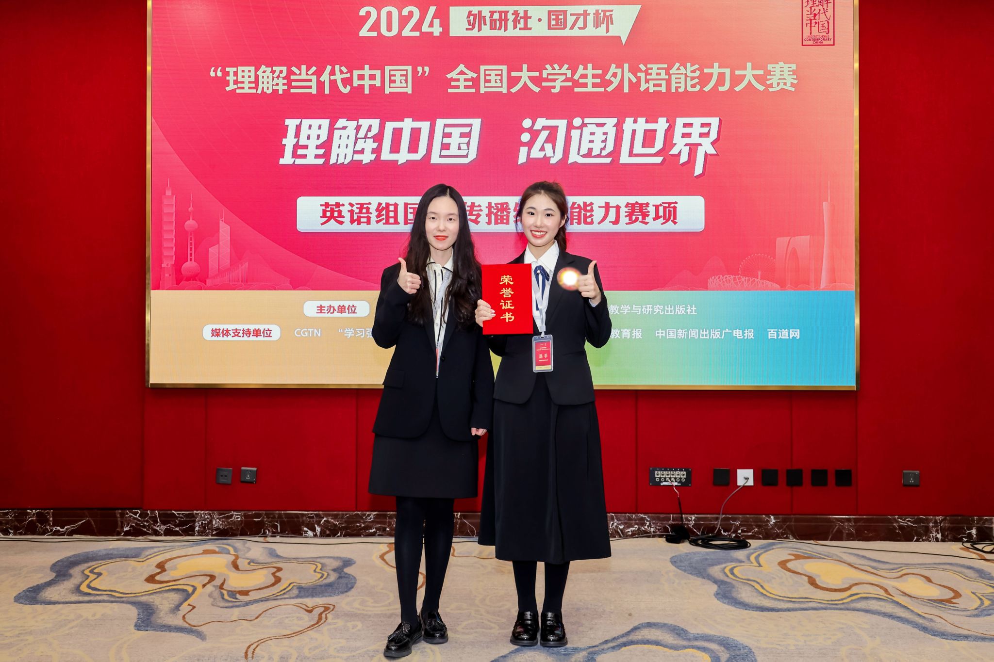 12月9日,2024“外研社·国才杯”“理解当代中国”全国大学生外语能力大赛全国总决赛落幕。湖北工业大学外国语学院学子经过校赛、省赛和全国总决赛的多轮激烈角逐,从1314所高校的360572名参赛者中脱颖而出。其中由王哲、刘艳两位老师指导的2022级创新英语班潘芷萱同学荣获英语组国际传播综合能力赛项全国总决赛金奖(省属高校排名第一),2023级创新英语班肖敬羽荣同学获全国铜奖,2021级英语1班周雪倩同学获省级二等奖。这是我校继2023年首届“外研社·国才杯”“理解当代中国”大学生英语综合能力大赛演讲赛项斩获全国银奖(省属高校排名第一)后,在质量上和数量上取得的新突破。