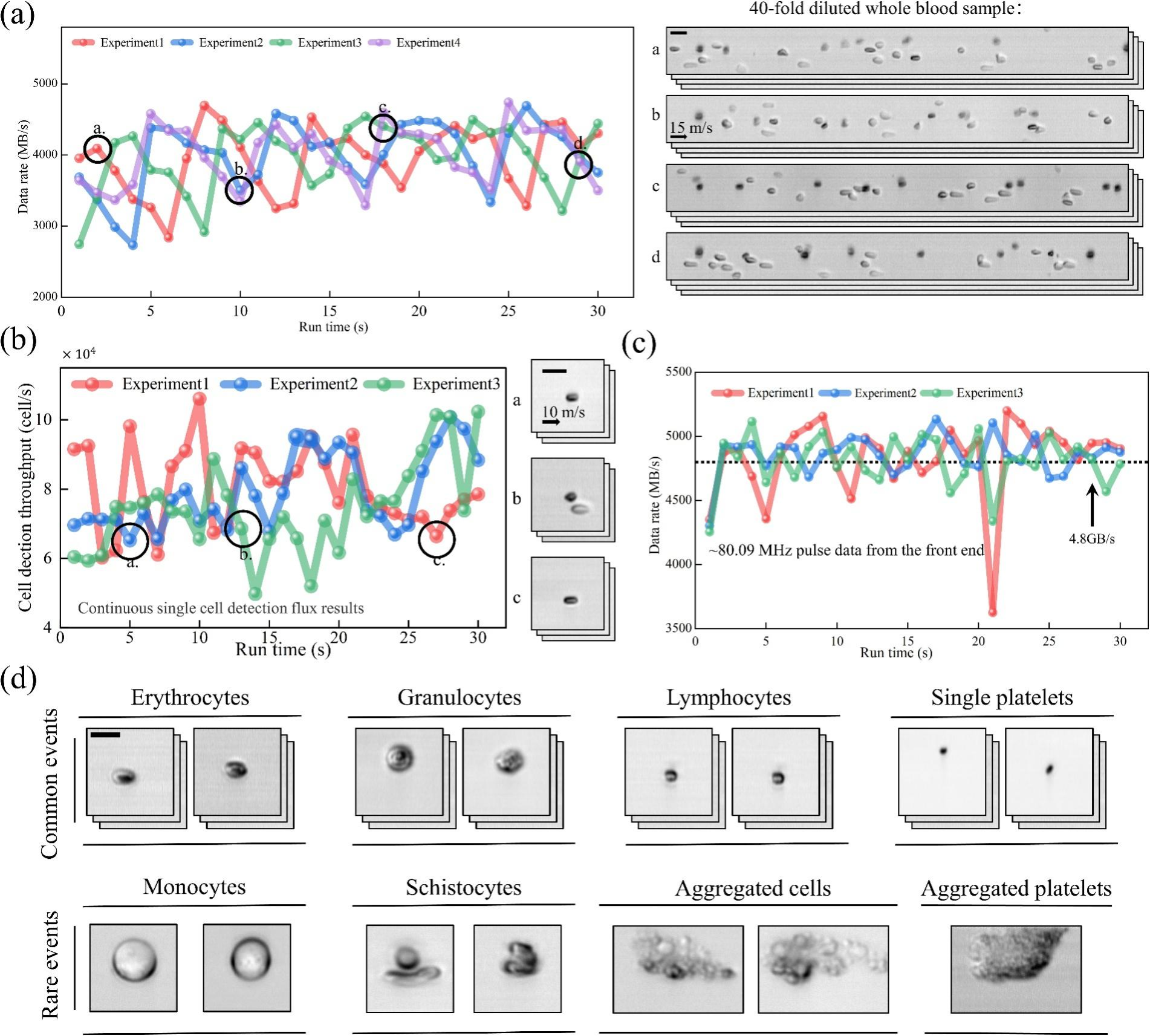 研究团队通过多次测试稀释后的全血样品,系统成功实现了每秒1,000,000个事件(eps)的连续检测吞吐量,并能够精准触发每张单细胞图像并进行实时在线分析。通过将获取到的图像数量与样品浓度进行对比,系统可以实现几乎无损的检测。此外,系统还具备独特的高通量检测下识别稀有事件的能力(稀有事件定义为占总事件比例低于0.01%的特殊情况),这一功能是现有其他系统无法实现的。在单次的全血样品检测中,在没有任何标记的情况下,系统可以识别到如单核细胞、高流速高压力下裂解的细胞、聚集的细胞群、以及导致血栓形成的聚集血小板等现象。这一独特的功能为生物学研究和临床医学诊断提供了全新的可能性,拓宽了应用场景和研究领域的大门。