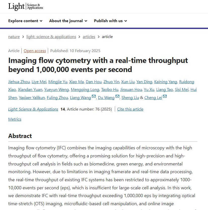 近日,湖北工业大学计算机学院青年教师梅礼晔与武汉大学雷诚教授在国际光学顶尖期刊《Light: Science & Applications》发表了题为“Imaging flow cytometry with a real-time throughput beyond 1,000,000 events per second”的研究论文(论文链接:https://doi.org/10.1038/s41377-025-01754-9)。梅礼晔博士和武汉大学周杰华博士为论文共同第一作者,武汉大学雷诚教授、王度教授、华中科技大学王亮教授为该论文的共同通讯作者。《Light: Science & Applications》是Nature子刊中极具影响力的光学类期刊,于2012年创办,2023年最新影响因子为20.6,连续9年稳居世界光学期刊榜前三。