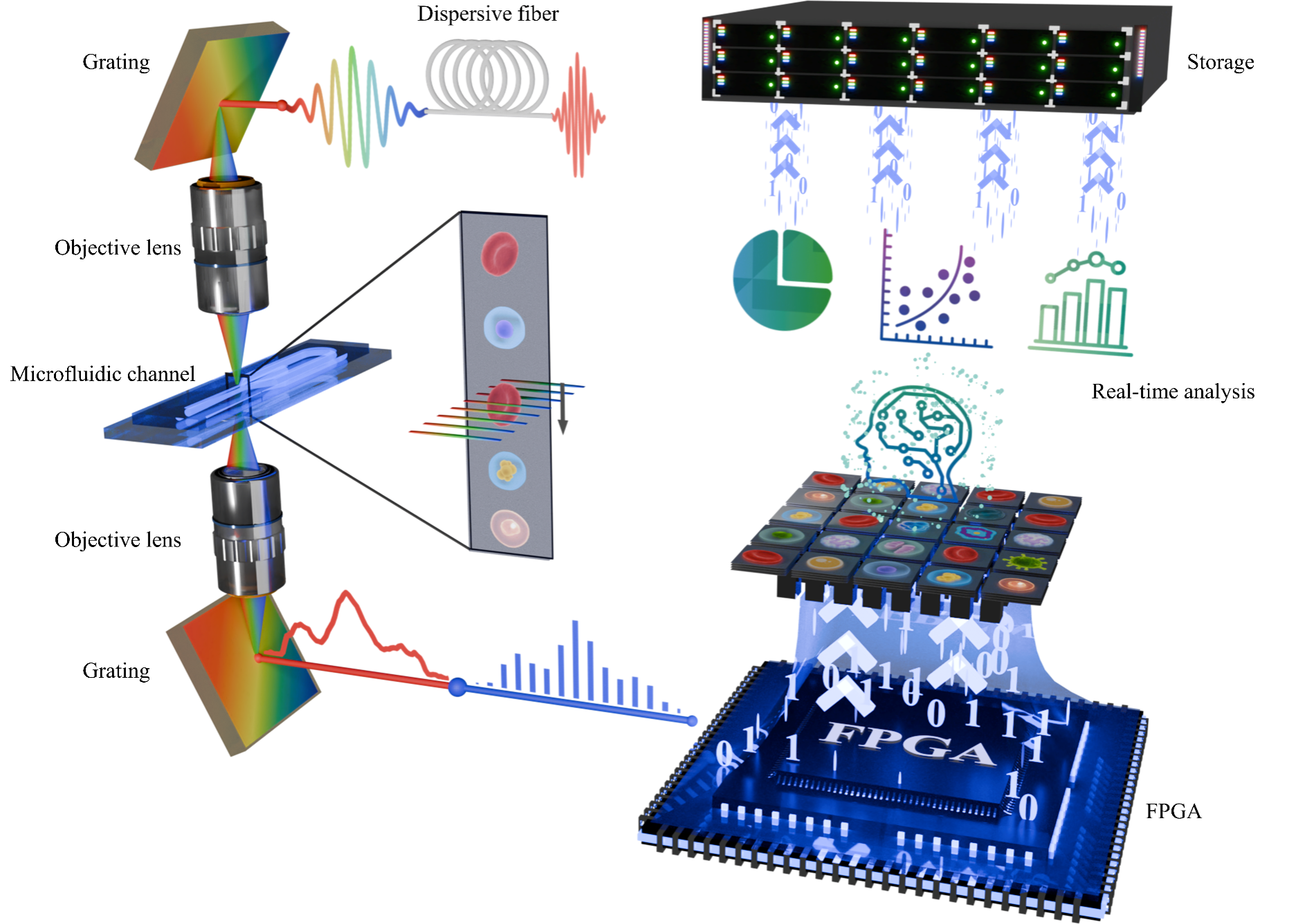 研究团队创新性地联合设计了光学时域拉伸成像系统、三维聚焦微流控芯片,并结合在线模数转换器(ADC)和现场可编程门阵列(FPGA)的数据采集与处理系统,通过高性能的在线图像识别、处理和分析算法,成功研发出新一代智能光流控时域拉伸成像流式细胞仪。该系统的实时检测通量突破性地达到每秒超过1,000,000个细胞,创下了目前世界上实时细胞检测通量的新纪录。相比现有高通量技术,该系统性能提升了2~3个数量级,同时实现了780 nm的高空间分辨率,将原本仅停留在理论层面的高性能指标转化为现实应用。这一技术突破不仅为成像流式检测领域带来了全新的视角和可能性,也为该技术的实际应用落地提供了坚实的技术基础。