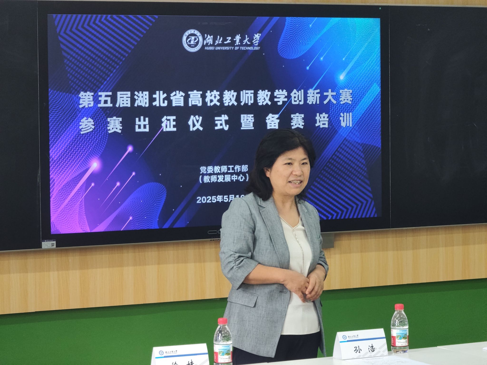 在出征仪式上,党委教师工作部部长徐妹首先介绍了大赛整体情况、网评结果以及我校选手的备赛情况,党委教师工作部副部长韩东则对现场环节的参赛注意事项和备赛安排进行了具体说明。随后,校党委副书记胡晓艳在讲话中充分肯定了参赛教师和所在学院前期的努力与付出,鼓励大家在大赛中要以饱满的热情、昂扬的斗志展现湖工大教师的风采,并预祝各位选手在比赛中取得优异成绩。