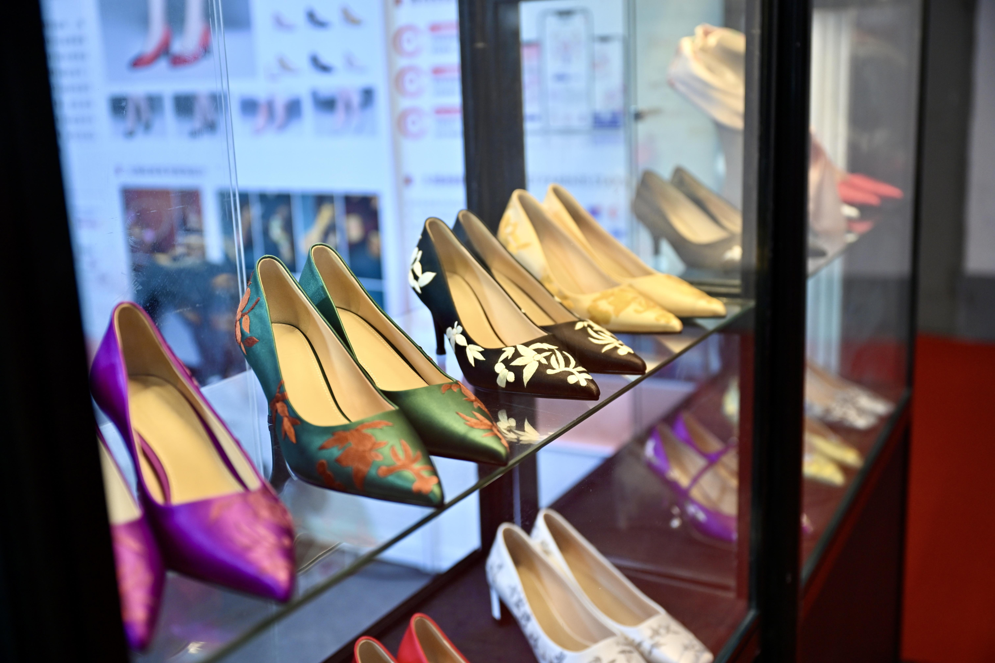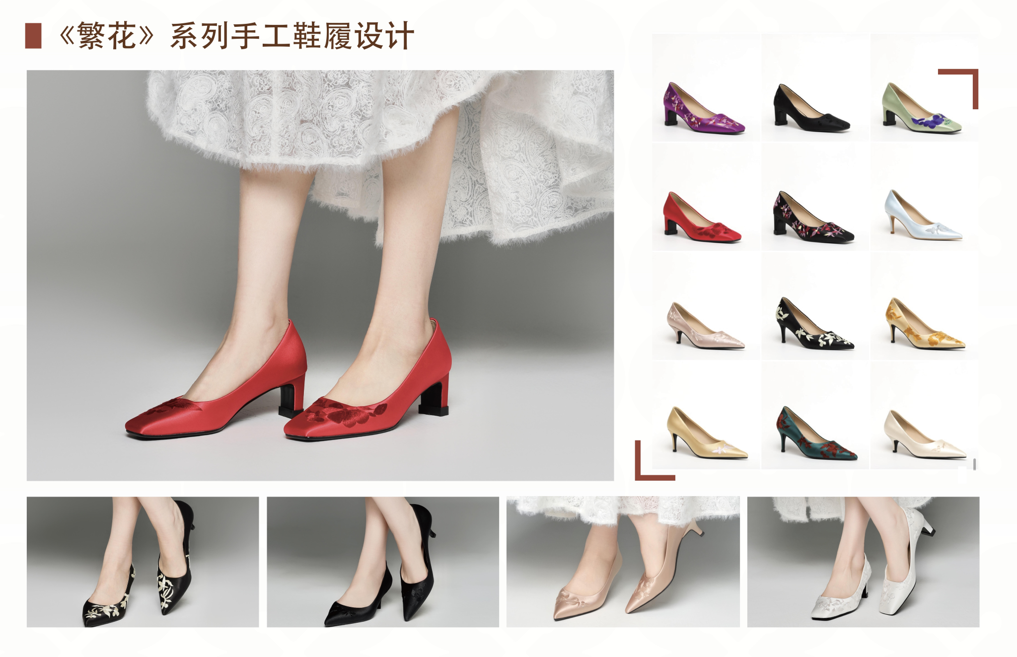 展出中,研究院呈现了以大悟刺绣为核心的设计创新成果,包括首饰、服饰配饰、国潮鞋履、陈设艺术品等多款产品,刺绣与现代设计相融合的产品吸引了众多观众驻足,并得到多家参展商的认可。其中,《繁花》系列高跟鞋尤为引人注目,设计师将大悟汉绣中的传统纹样与现代鞋履廓形巧妙融合,由大悟县绣娘妈妈手工绣制,将大悟刺绣文化符号转化为可穿戴的时尚语言,每双鞋都有其独特的魅力。这些产品不仅成为本次博览会现场采购商关注的焦点,更标志着研究院从文化研究向消费市场的跨越,让非遗技艺真正走进大众生活。