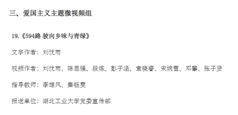 近日,由教育部指导、《中国教育报》主办的“高校爱国主义教育案(课)例和大学生爱国主义主题微视频征集”活动推选作品名单公布,我校党委宣传部报送的微视频《594路 驶向乡味与青绿》从全国高校约2000件参赛作品中脱颖而出,成功入选大学生爱国主义主题微视频。