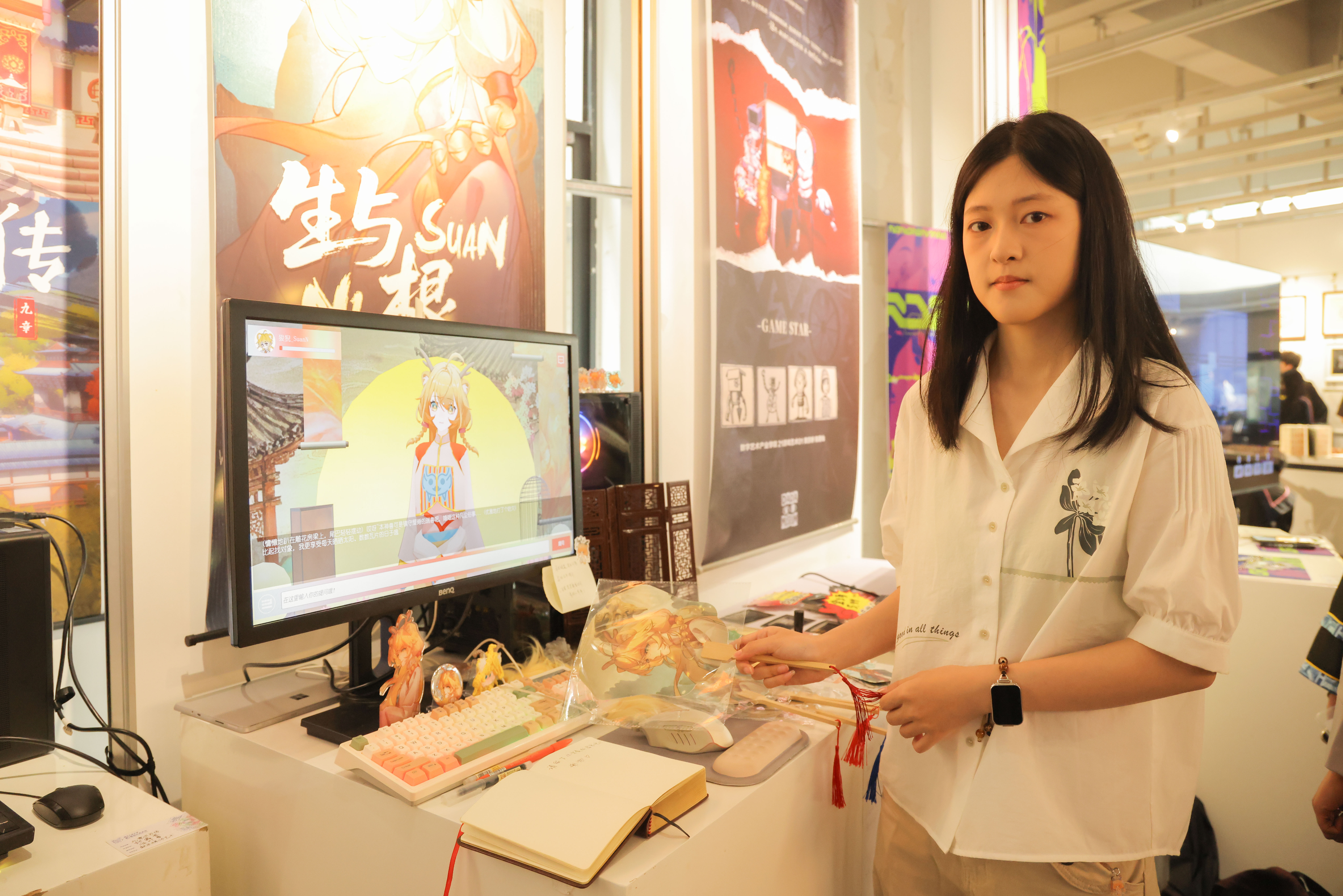 现场,不少观展者在毕业生刘雅婷的互动游戏作品《生与根》前驻足和试玩。作品以古代瑞兽狻猊为灵感,设计出二次元数字人形象。接入AI程序后,玩家可与数字人进行对话互动,人物会实时做出对应的表情和手势动作。