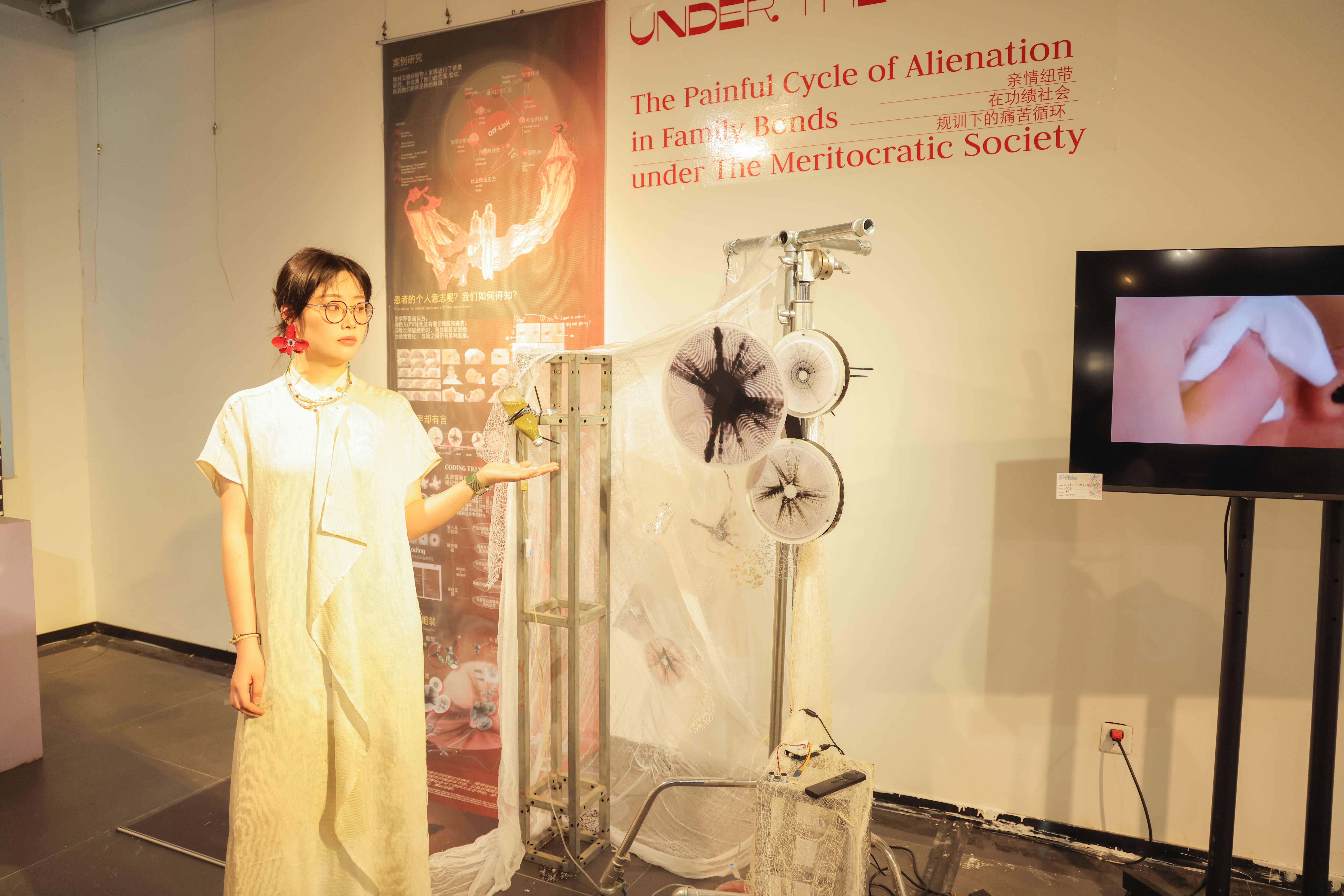 ▲毕业生沙识宇和她的作品《亲情纽带在功绩社会规训下的痛苦循环》