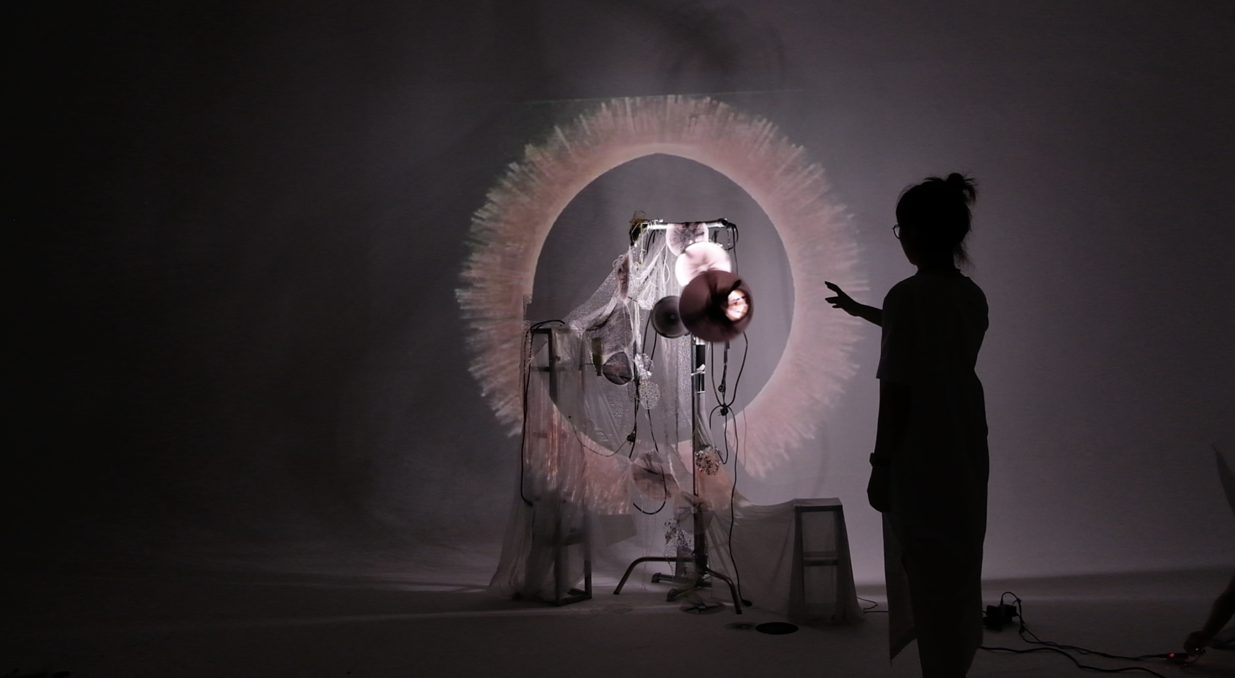 毕业生沙识宇用一套装置艺术,表达了对亲情、对死亡的思考。“奶奶重病卧床后,在长期照护中,亲人也陷入了情感困境。”她以医院滴注架为原型,将不同时段的病房内声波转化为眼球状转盘,电机驱动下,靠近装置的观众会触发转盘加速转动,模拟出照护过程中 “不可控、反复、混沌”的心理状态。
