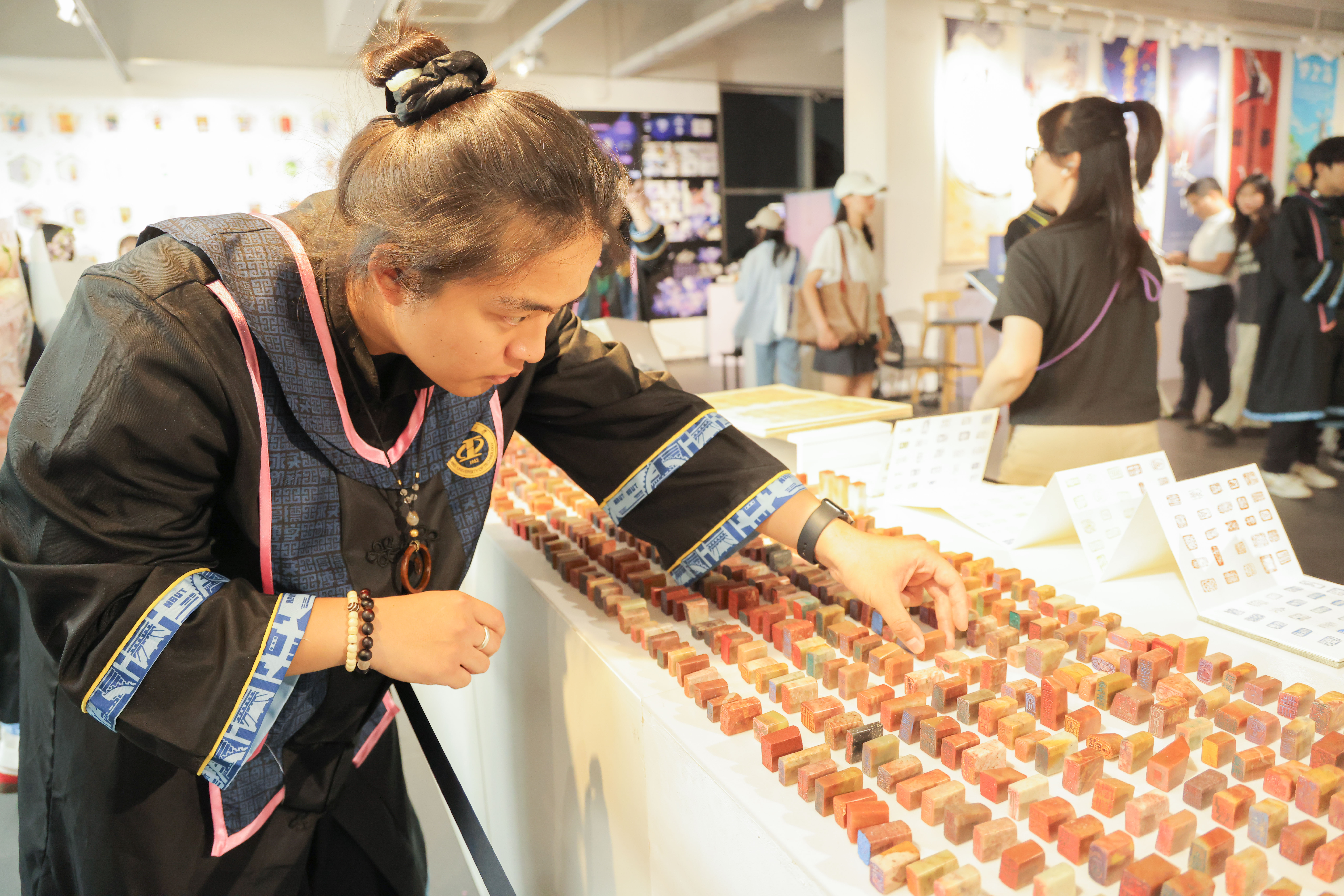 展览现场,3米展台上,大四毕业生杨龙的1001方寿山石印章整齐排列,红、金、蓝、绿、白五色印泥点缀其间,格外吸睛。