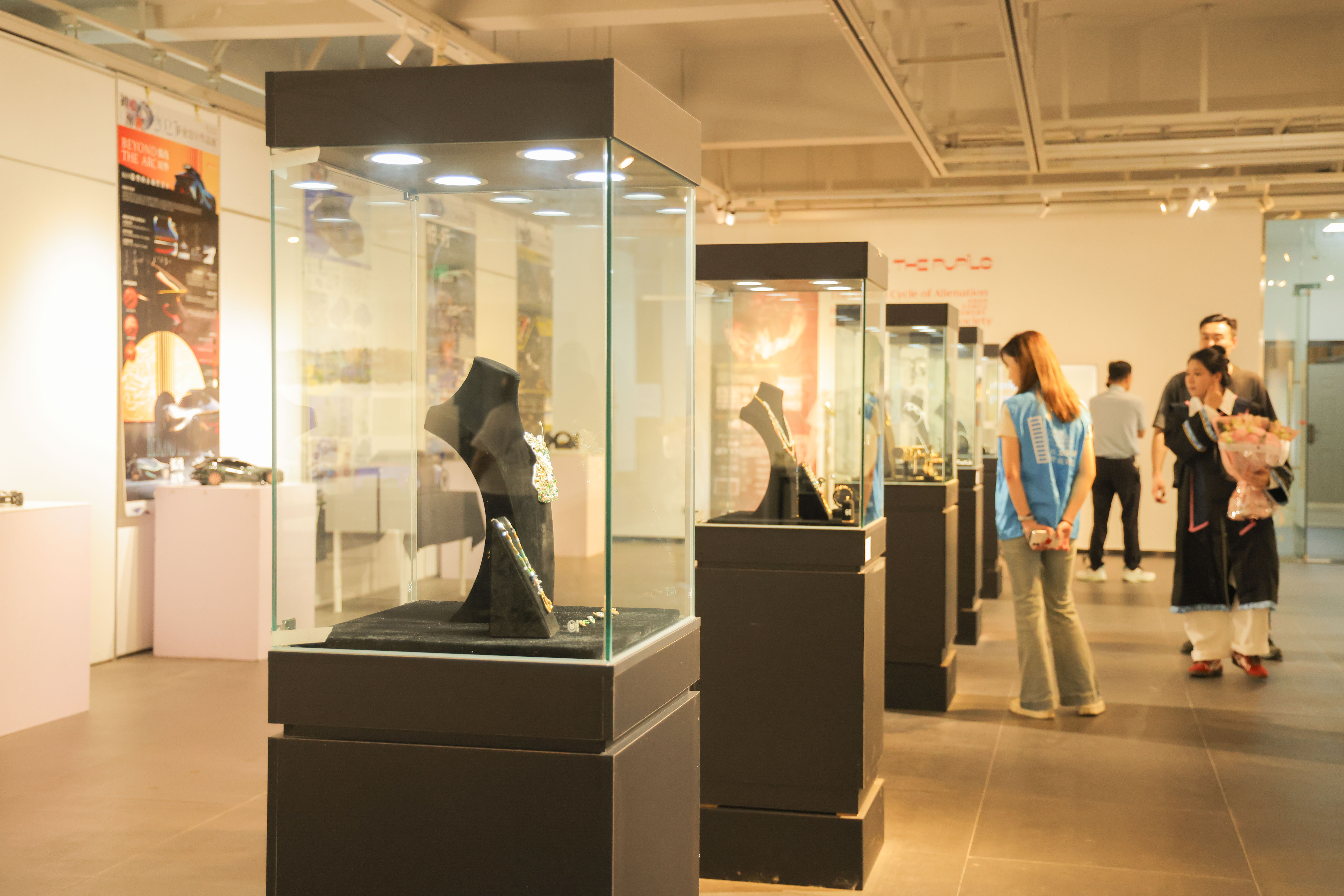 另一旁的首饰设计展区,同样也巧妙地融合非遗技艺与当代理念。毕业生梁雨欣利用废弃陶瓷片,设计制作出系列首饰《瓷韵璎珞》。她从景德镇收集来陶瓷碎片,让它们穿上珍珠或镶上钻石,变废为宝。