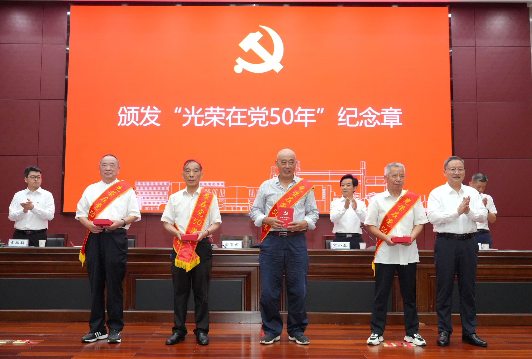 校纪委书记秦防修宣读《“光荣在党50年”老党员名单》;校党委书记彭育园为4名老党员代表颁发“光荣在党50年”纪念章。