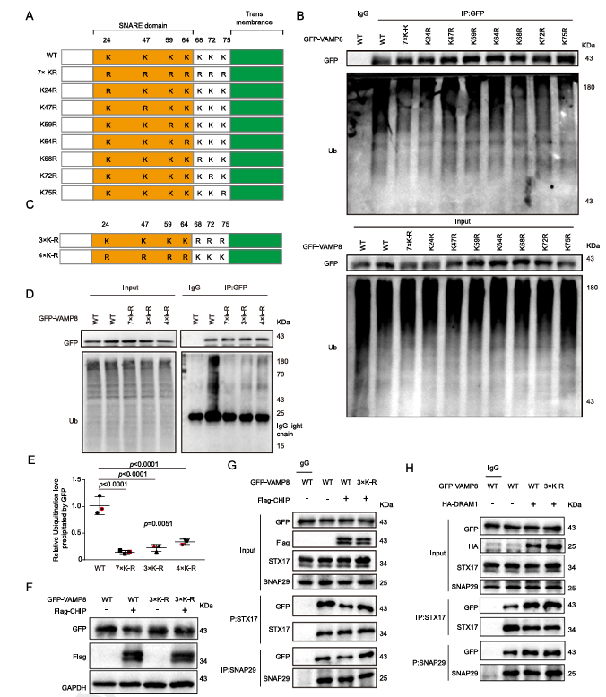 随后,课题组利用质谱鉴定技术发现多个相关的E3泛素化连接酶与VAMP8相结合,并最终证实CHIP是VAMP8泛素化的关键E3连接酶。进一步的研究发现,DRAM1可竞争性的同CHIP与VAMP8的结合,主要抑制了VAMP8在Lys68、72和75位点的泛素化修饰,从而维持溶酶体VAMP8的蛋白稳定性。