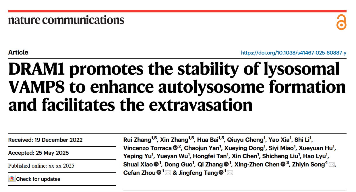 2025年7月3日,我校生命科学与健康工程学院、细胞调控与分子药物“111”引智基地、发酵工程教育部重点实验室唐景峰、周策凡团队在Nature子刊Nature Communications(IF=15.7)发表了题为“DRAM1 promotes the stability of lysosomal VAMP8 to enhance autolysosome formation and facilitates the extravasation”的科研成果。我校为论文第一署名单位,生命科学与健康工程学院张瑞副教授为第一作者,湖北工业大学唐景峰、周策凡为共同通讯作者。
