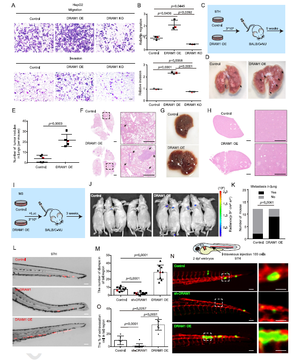 最后,该团队分别利用小鼠尾静脉注射转移模型,发现了DRAM1能够促进肝癌细胞在靶器官,肺脏和肝脏上的转移,这表明DRAM1促进了肝癌细胞的血管外渗过程。接着,通过荧光素酶活体成像实验发现,DRAM1提高了肝癌细胞的肿瘤转移率。最后,利用斑马鱼血管模型和斑马鱼脑室血脑屏障模型也证实了DRAM1促进肝癌细胞的血管外渗过程,且该过程依赖于DRAM1所调控的自噬体降解功能。