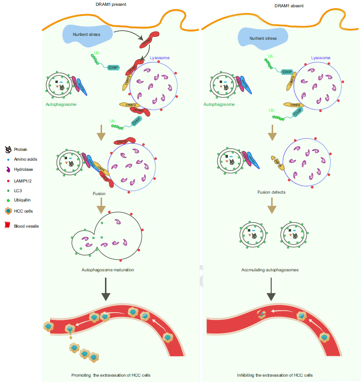 转移是导致肿瘤患者死亡的首要原因。肿瘤细胞从原发部位经血管扩散至远端器官,这一过程称为外渗(extravasation),即肿瘤细胞在血管中存活并穿出血管壁。成功转移的先决条件是循环肿瘤细胞(CTCs)能够在血管内存活。然而,进入循环系统的绝大多数肿瘤细胞会因营养应激、免疫清除及血流剪切力等因素在短期内被迅速清除。因此,开发靶向外渗过程的治疗策略,对抑制转移具有重大意义。近年研究发现,自噬可帮助循环肿瘤细胞在血液中存活。自噬体与溶酶体的融合是自噬过程的终末关键步骤,其分子机制依赖于多层级膜转运机器(如SNARE复合物介导的膜融合)和精密时空调控网络,但具体调控机制尚未完全阐明。本研究首次证实DRAM1通过调控自噬活动促进肝癌细胞血管外渗过程中发挥关键作用。该研究不仅阐明了DRAM1-VAMP8调控自噬溶酶体形成的新机制,更为抑制肝癌转移提供了潜在的治疗策略。