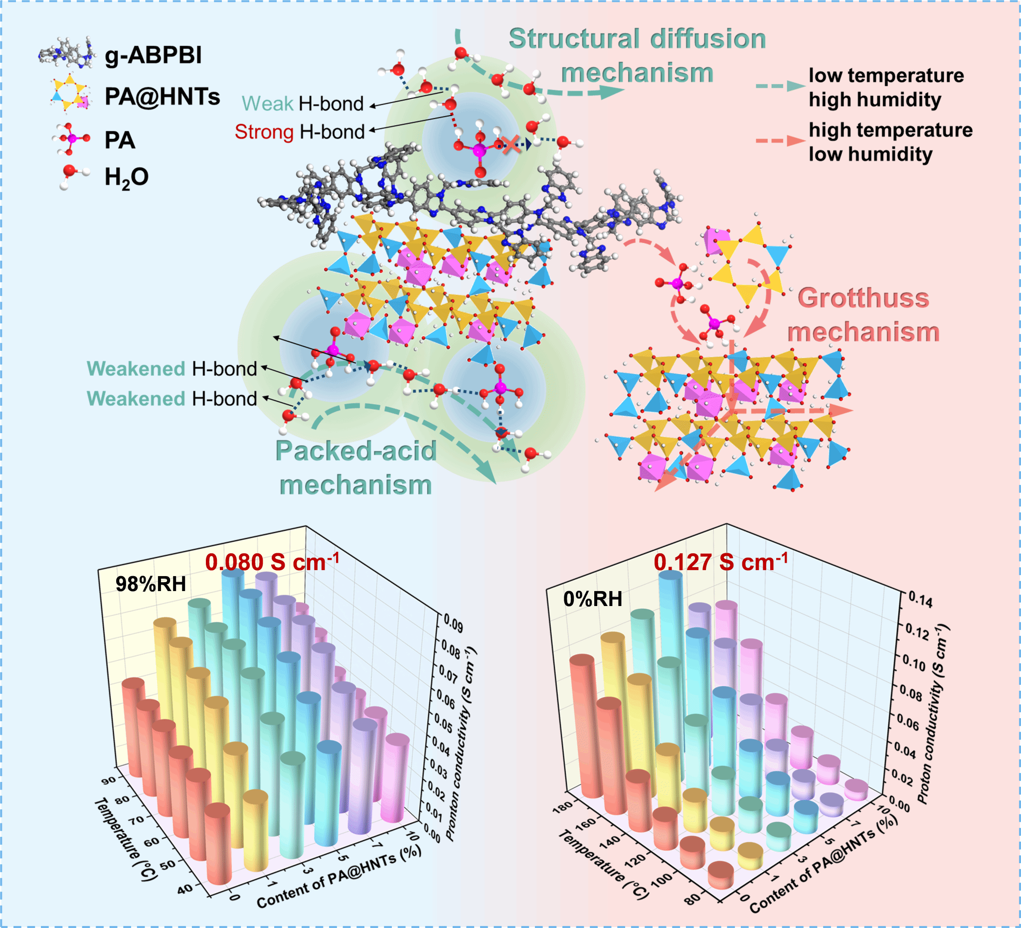 在追求清洁能源的道路上,氢燃料电池因其高效、零排放的特性成为全球研发热点。然而,长期以来,磷酸(PA)掺杂聚苯并咪唑膜在实际应用中面临PA渗漏、塑化效应、关键组件中毒等难题,制约了其进一步发展。针对以上问题,本研究提出了一种具有三维质子传导网络的磷酸嵌入埃洛石(PA@HNTs)的Acid-in-Clay新型固态电解质,在180°C/0% RH条件下实现了85.81 mS cm-1的卓越质子传导率。通过原位聚合法将PA@HNTs引入接枝型聚苯并咪唑基体,成功开发出性能优异的自具微孔特征复合膜。当PA@HNTs含量为5 wt.%时,复合膜在90°C/98% RH和180°C/0% RH条件下的质子传导率分别达到0.080 S cm-1和0.127 S cm-1。这一优异性能源于复合膜中PA@HNTs这种地聚物电解质和亚纳米孔道中富含的大量PA构建了致密且连续的氢键网络,通过"packed-acid mechanism"与"Grotthuss mechanism"的协同作用实现了涵括高温无水、低温有水等复杂工况下超快质子传输。PA@HNTs/g-ABPBI复合膜为宽温域燃料电池的运行提供了具有前景的解决方案。