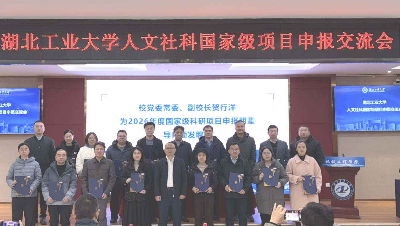 会议伊始,胡心彬宣读了《关于聘任湖北工业大学2026年人文社科国家级科研项目申报朋辈导师的决定》,本年度共聘任来自8个学院的26位教师担任朋辈导师。贺行洋为新任导师逐一颁发聘书。