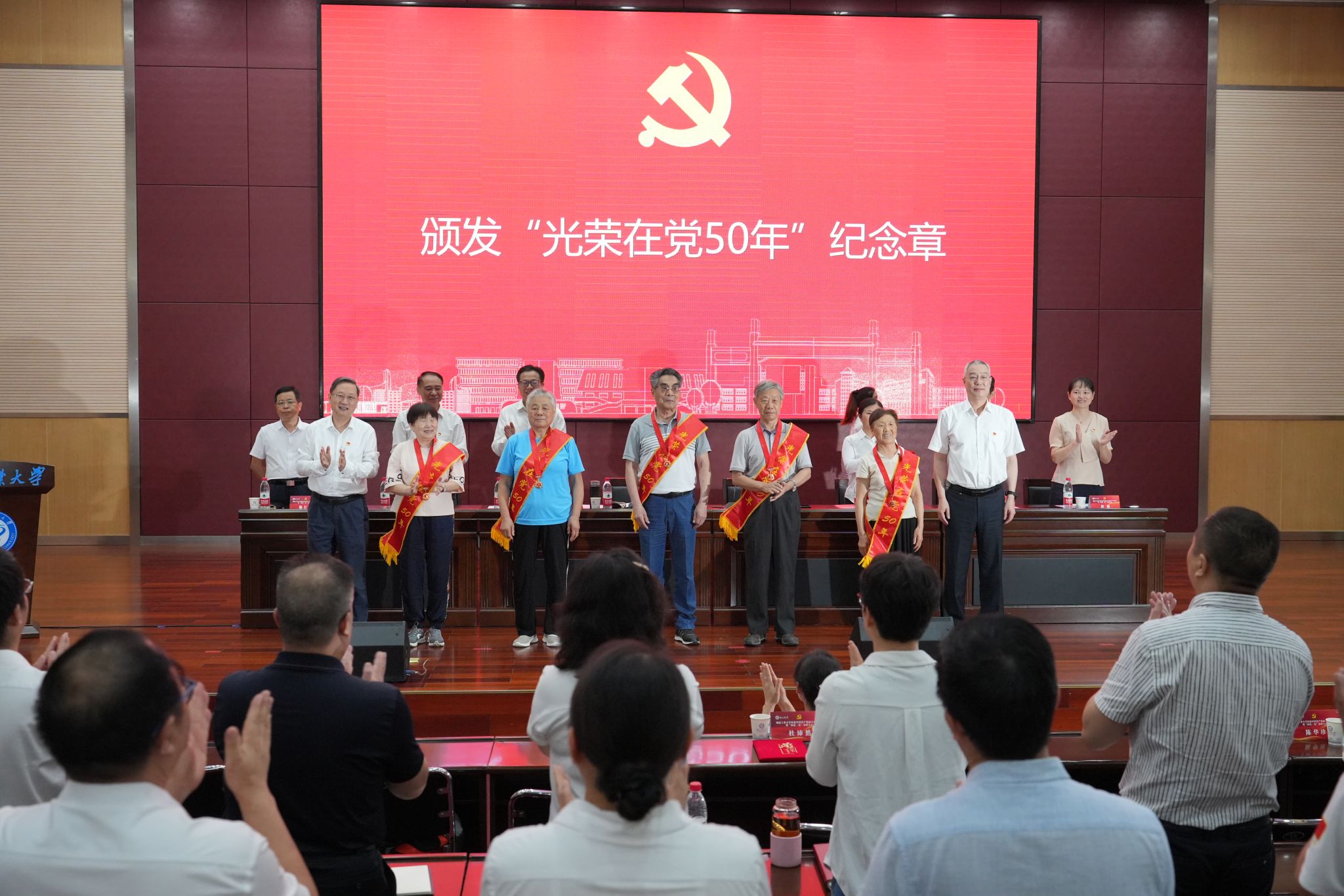 校党委副书记胡晓艳同志宣读2023年获得“光荣在党50年”纪念章名单。今年,我校有12位老同志党龄超过50年,大会特别邀请到李子翠、祖传友、武玉霞、陈华珍、杜沛然5位老同志代表参会。彭育园、冯征为他们颁发“光荣在党50年”纪念章。