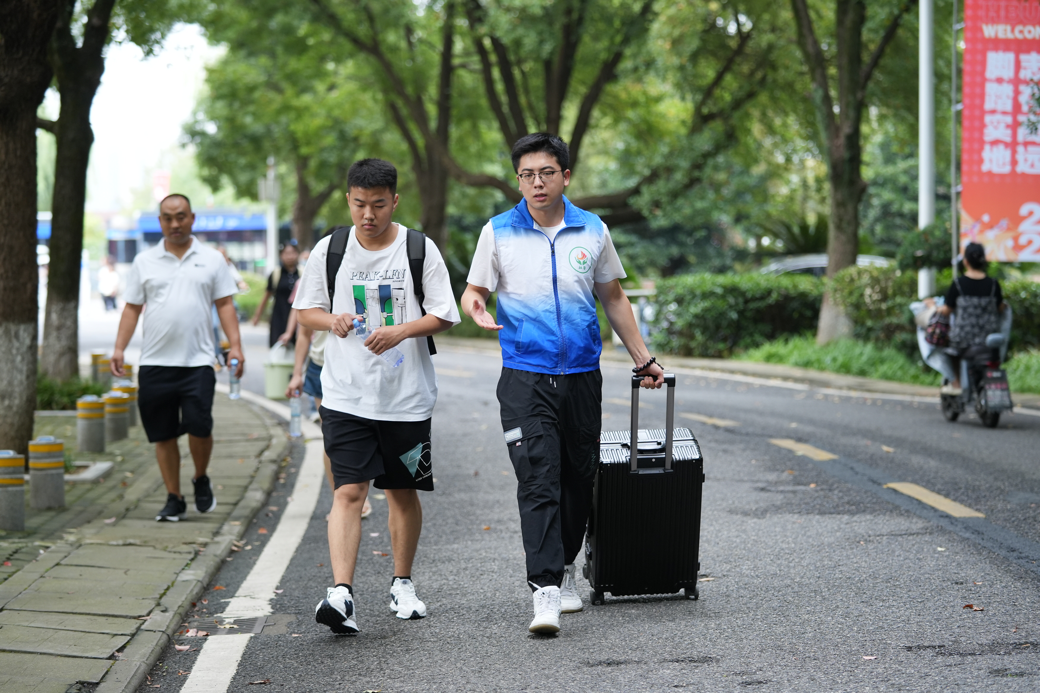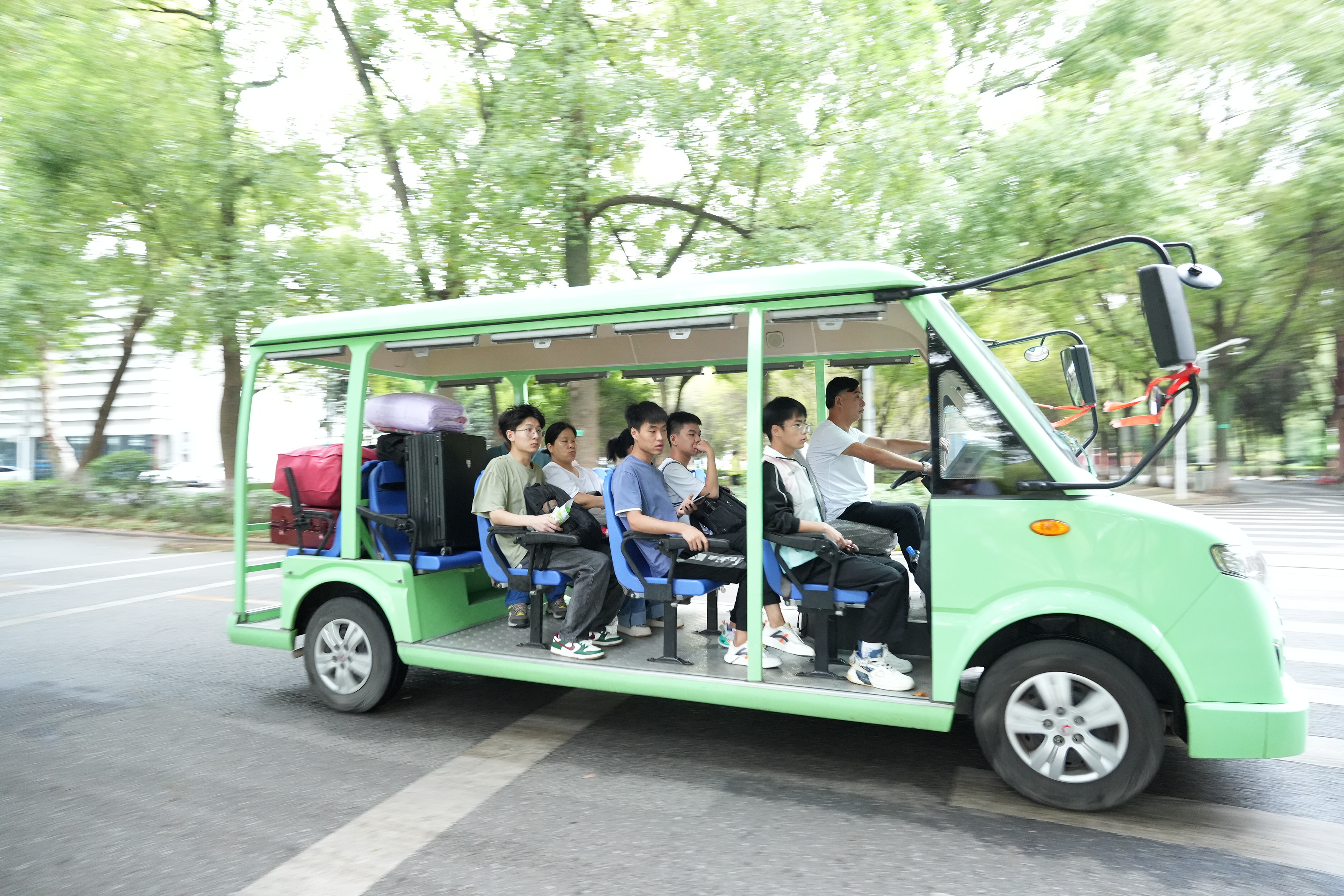 校园内外流畅衔接、秩序井然。摆渡车将新同学送至各学生宿舍园区,校园沿途设置的临时休息点提供免费饮用水与引导服务,入校私家车在校园微循环道路设计中有序行驶。