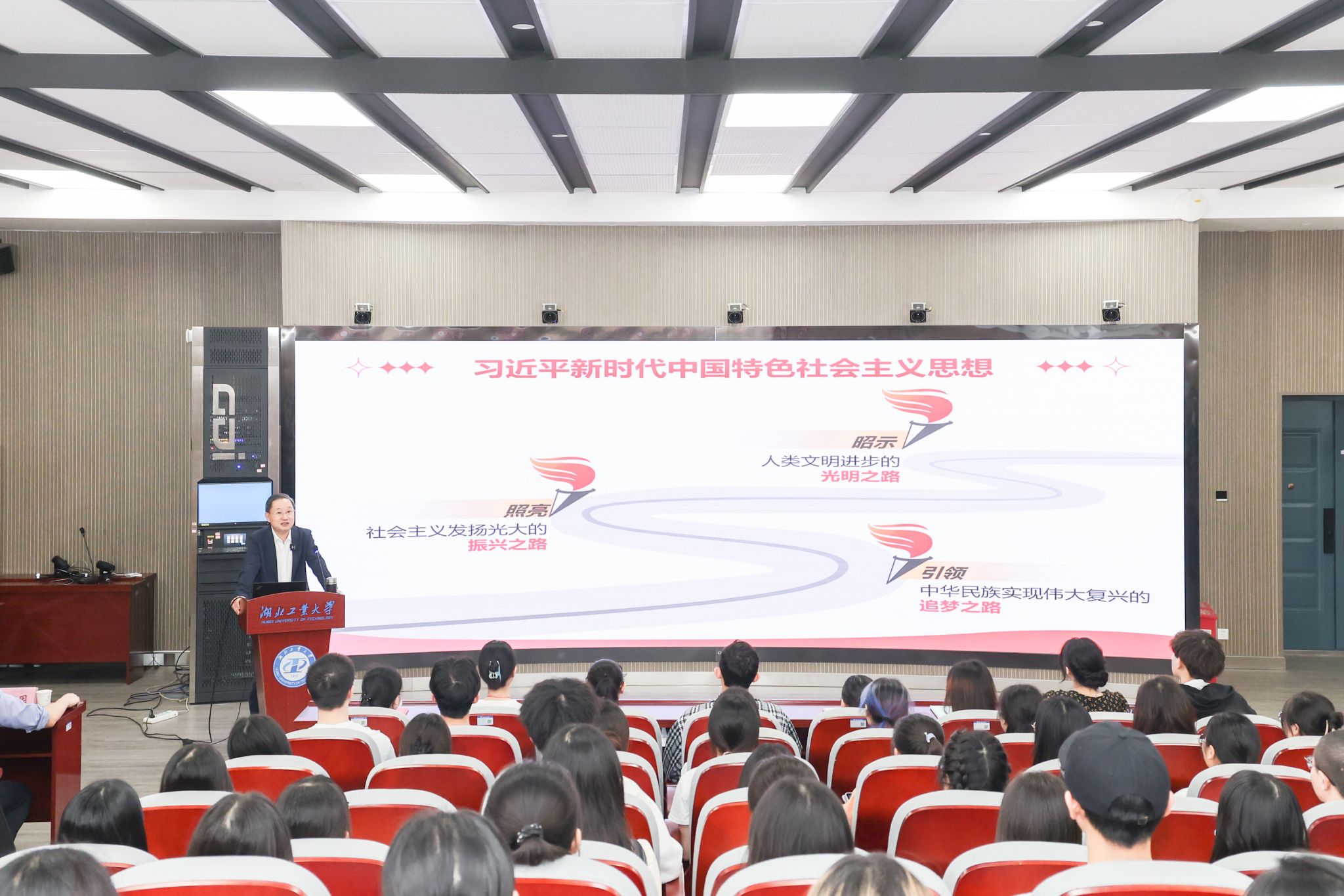 最后,彭育园勉励同学们,要用习近平新时代中国特色社会主义思想武装头脑,接好强国建设、民族复兴伟业的接力棒,始终将个人发展同祖国需要紧密结合起来,始终站在历史正确的一边,在推进中国式现代化进程中唱响“湖工人”的家国情怀和青春旋律。
