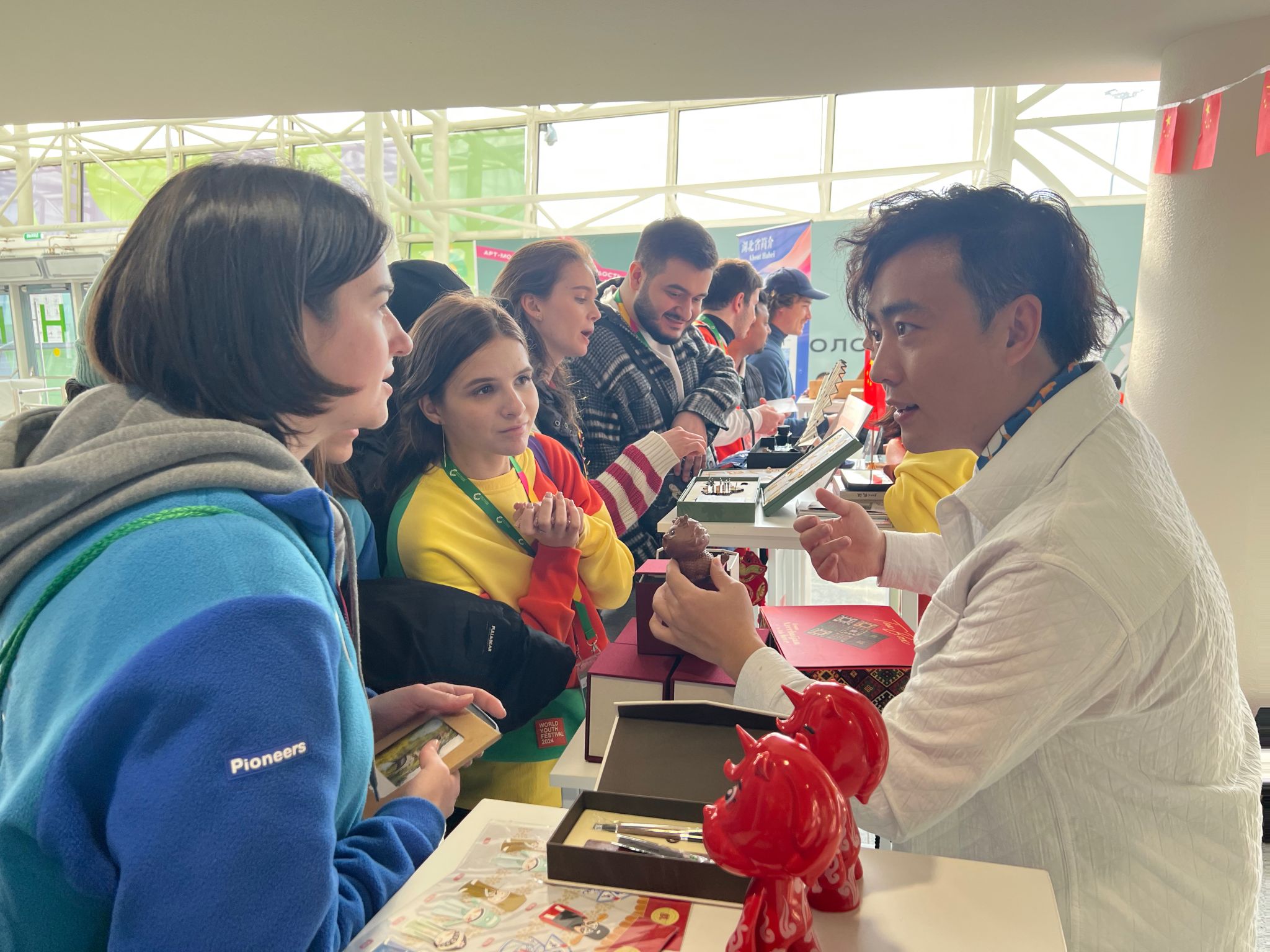 在中方代表团展会上,参加活动的俄罗斯青年对中国文创作品产生浓厚兴趣,主动与中国青年代表团进行沟通交流,了解中华文化,交换随行礼品。
