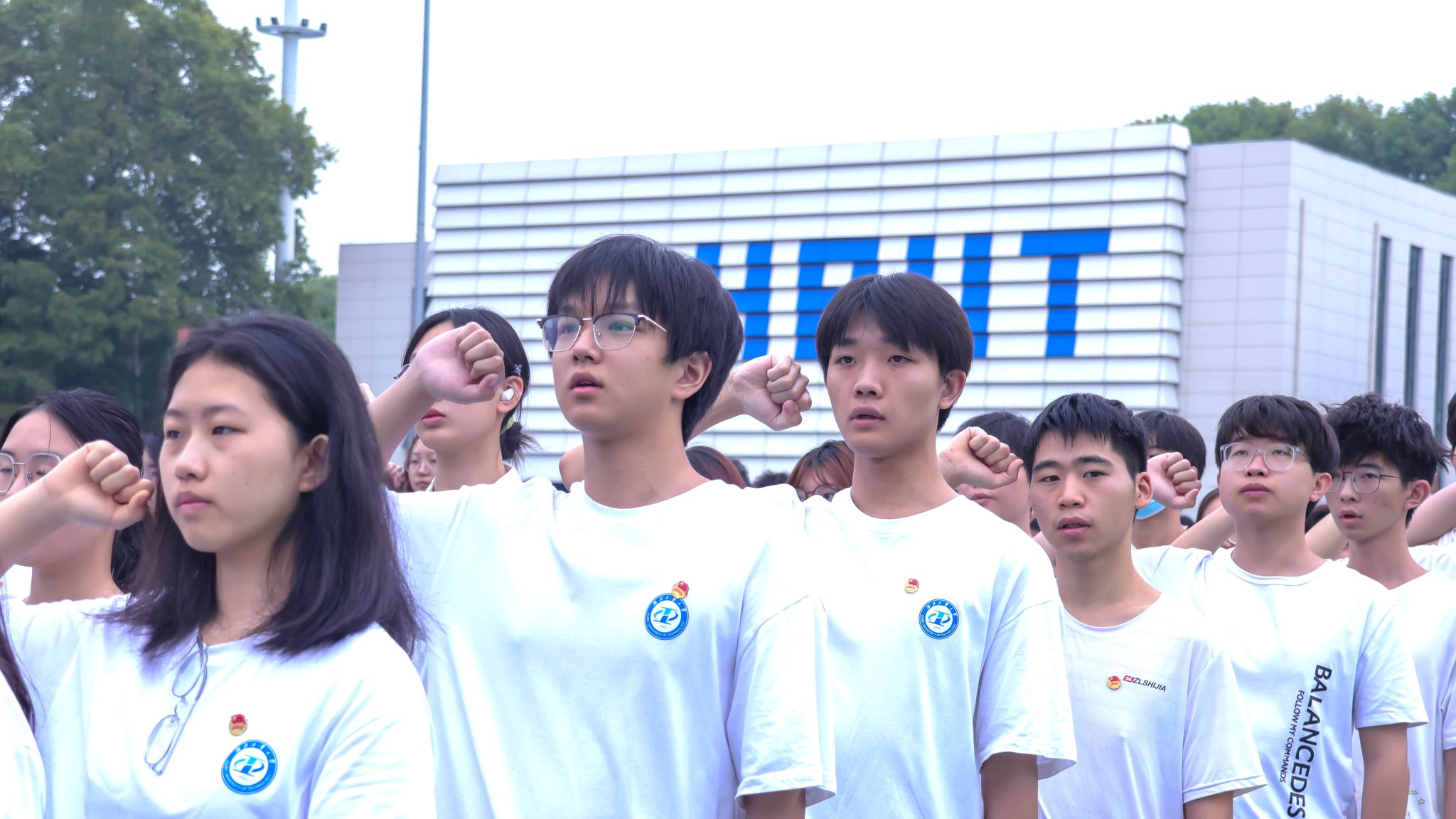 全体同学在雷铭宇的带领下,举起右手,面对国旗,郑重宣誓。“请党放心,强国有我!”的铮铮誓言响彻校园。