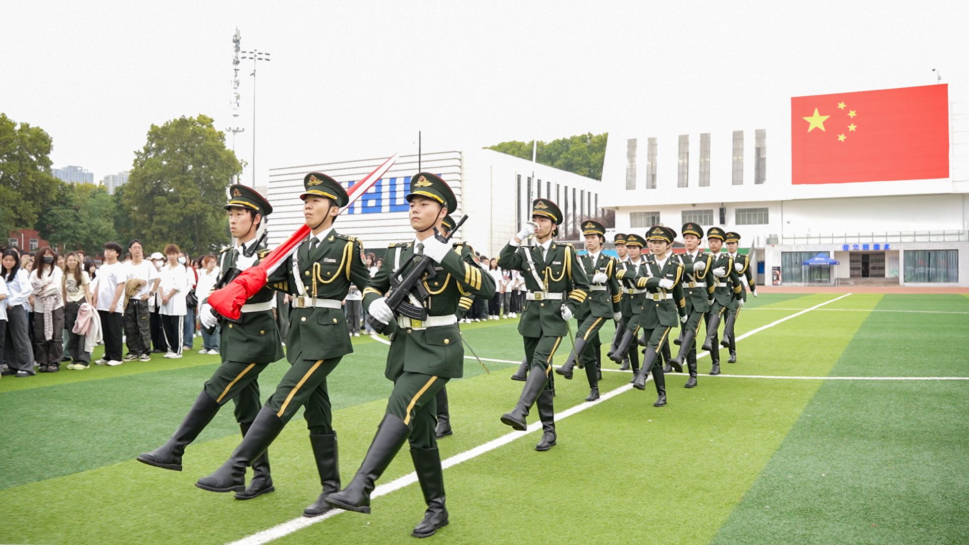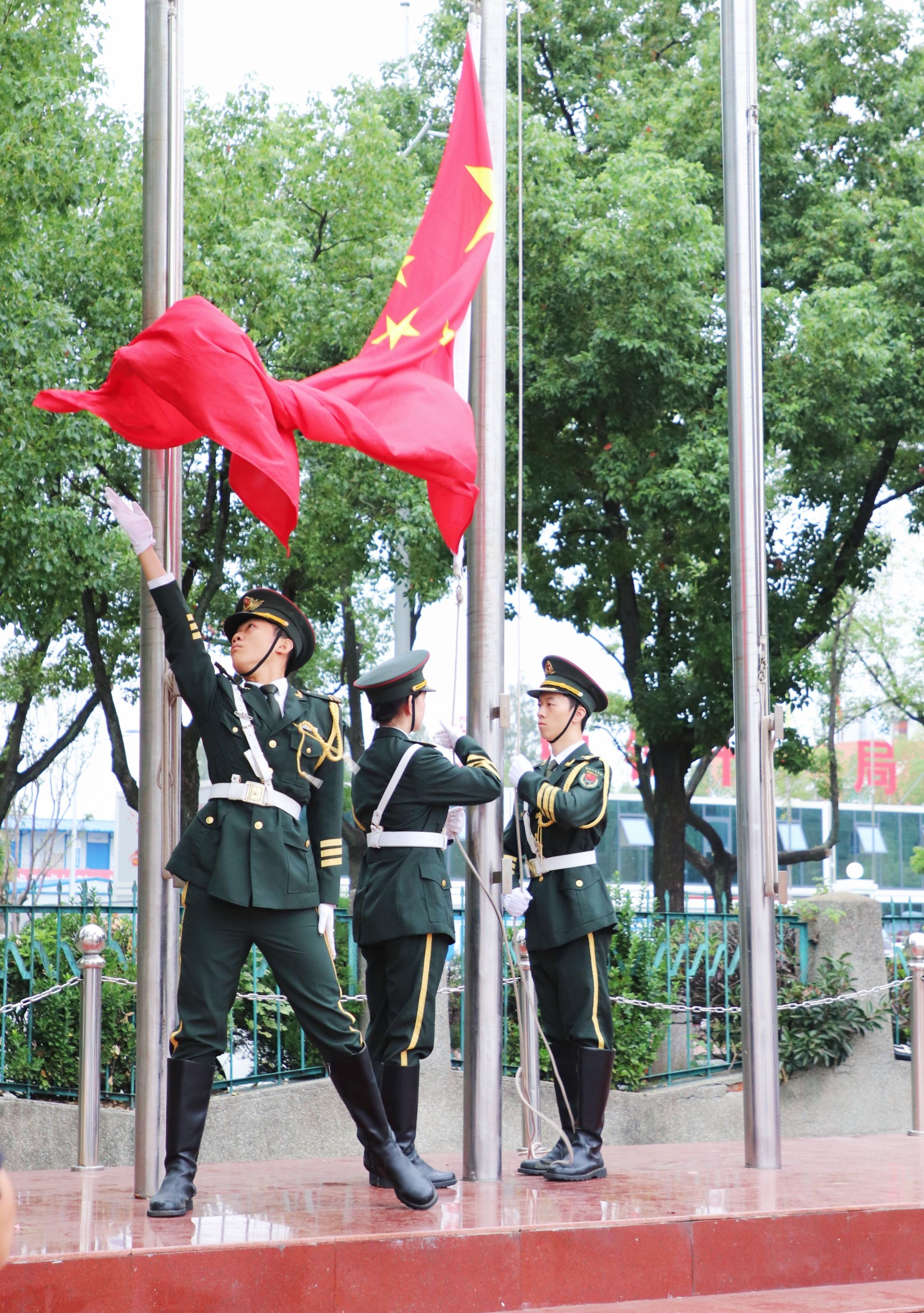 7时整,学校国旗护卫队队员迈着铿锵有力的步伐,护送国旗入场。伴随着庄严的《义勇军进行曲》,五星红旗在东升的旭日照耀下冉冉升起,青春的歌声在操场上空久久回响。